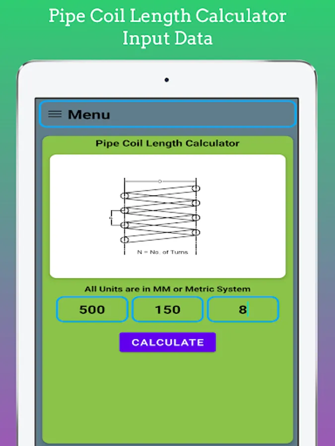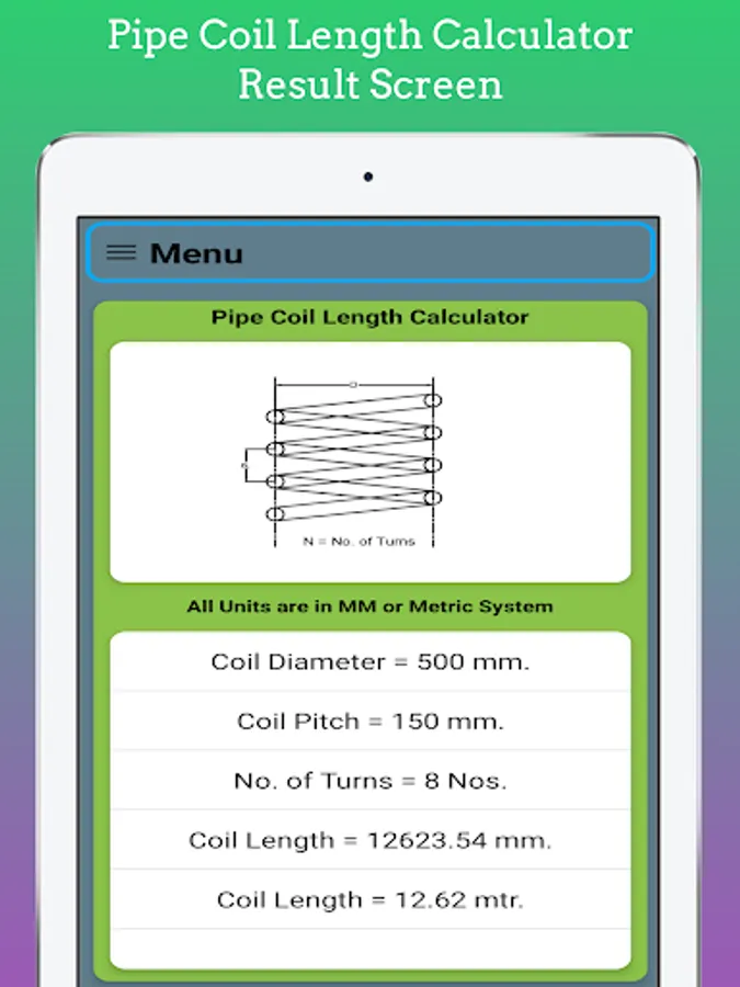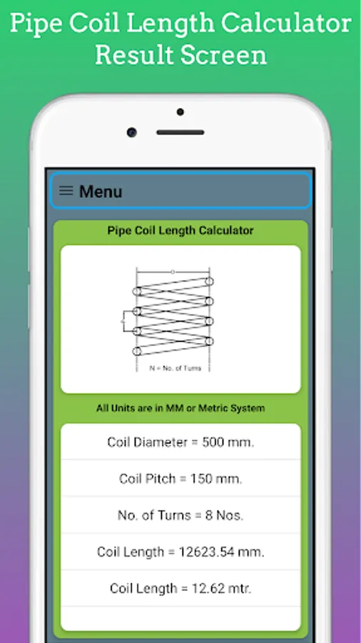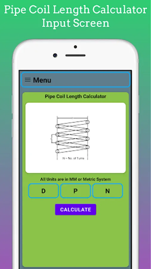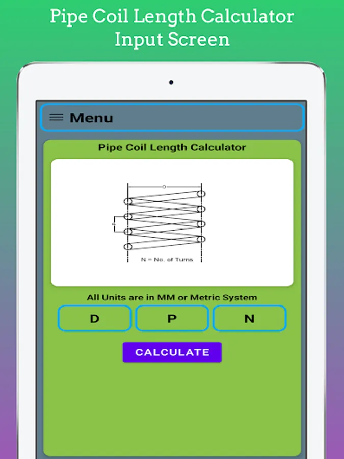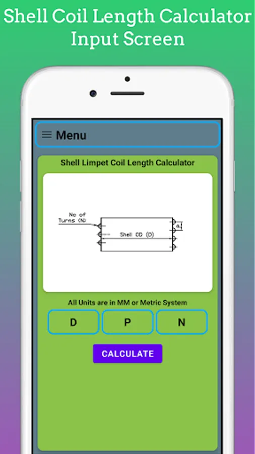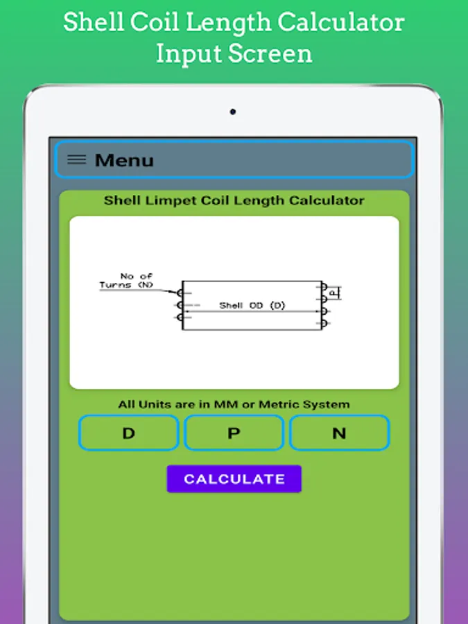 In This App length of Coil for Limpet on Shell Calculate by using Input as Shell Diameter, No. of Turns, Pitch of the Coil. You Can Easily estimate length for Coil for Costing and estimating Purpose.