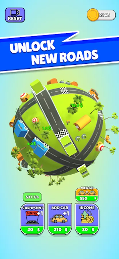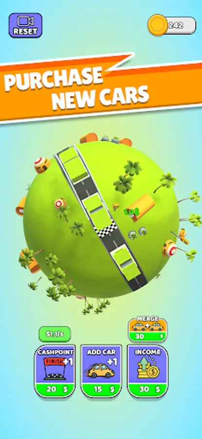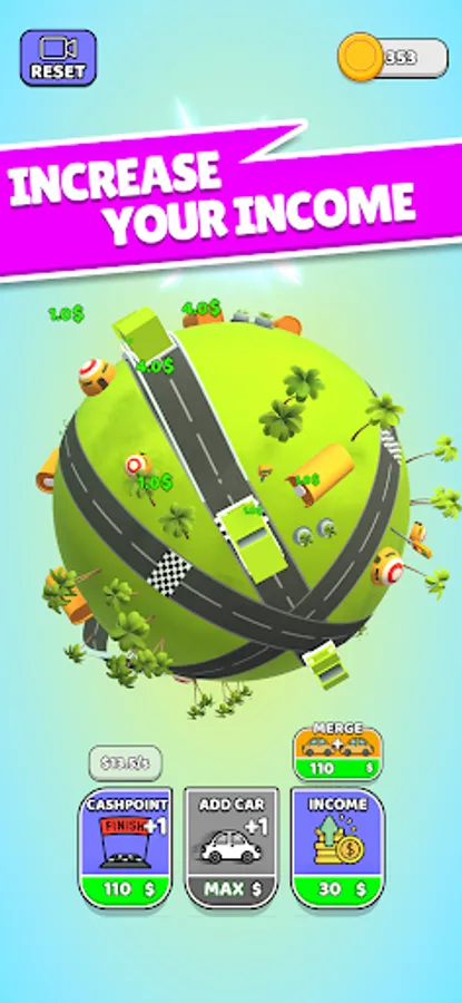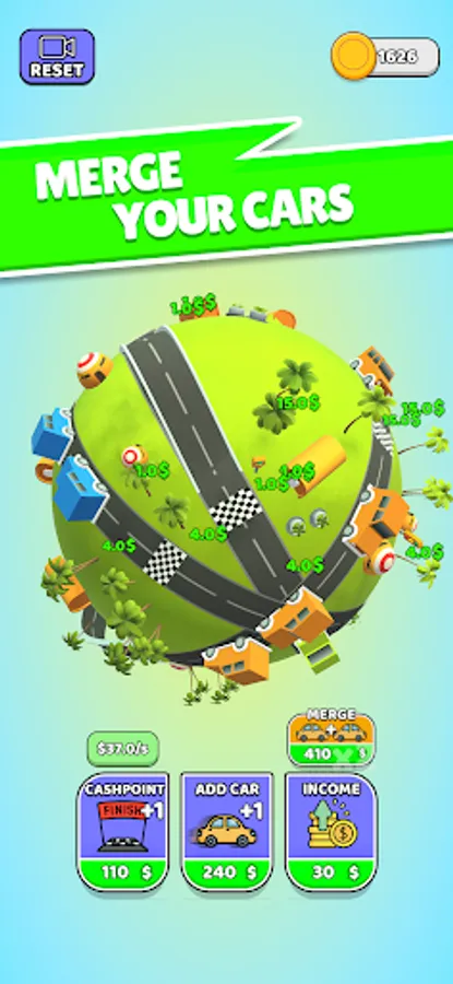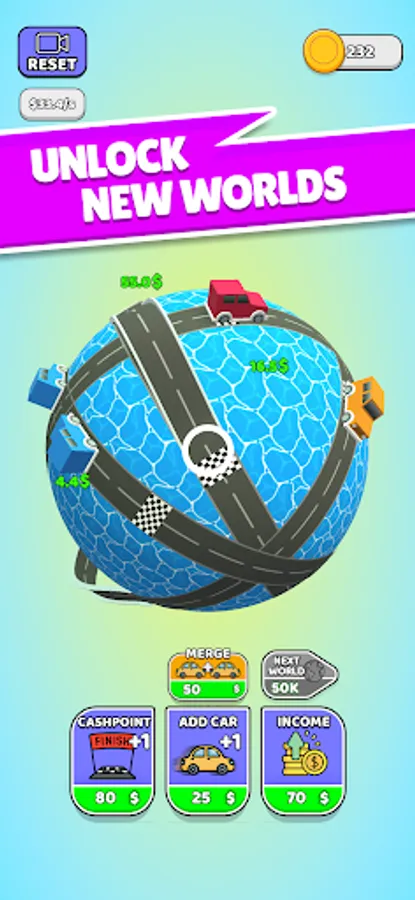 Buy new cars, merge them, add finishline increase your income and earn more and more to unlock new worlds!