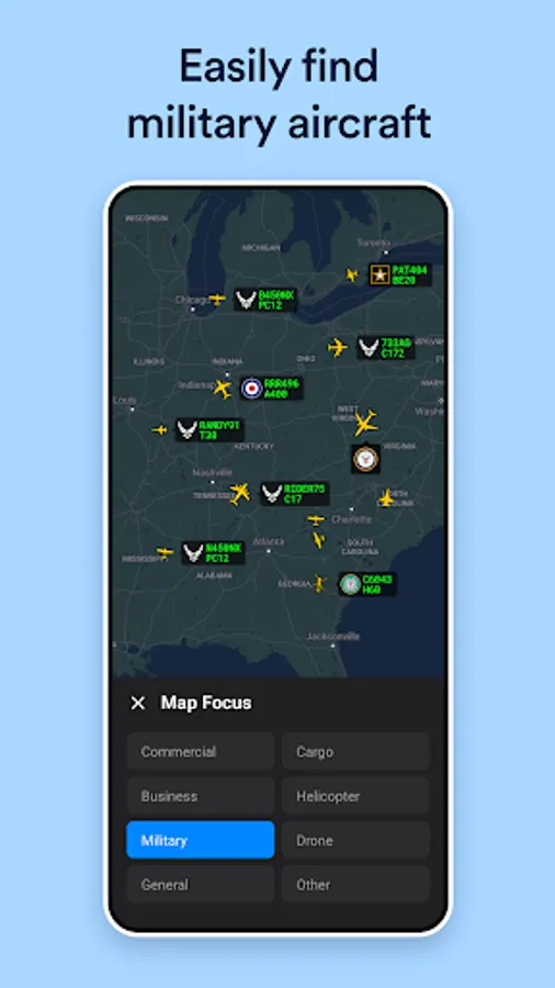 6 map toggles including Military and Cargo to quickly highlight aircraft you're interested in