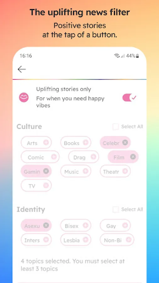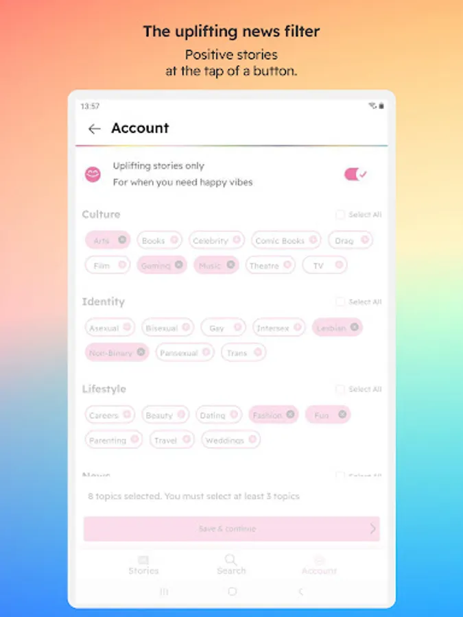 - Use our “Uplifting Stories” filter to only show you good news stories, for a happy-vibes-only experience
