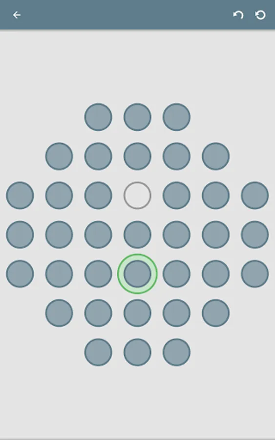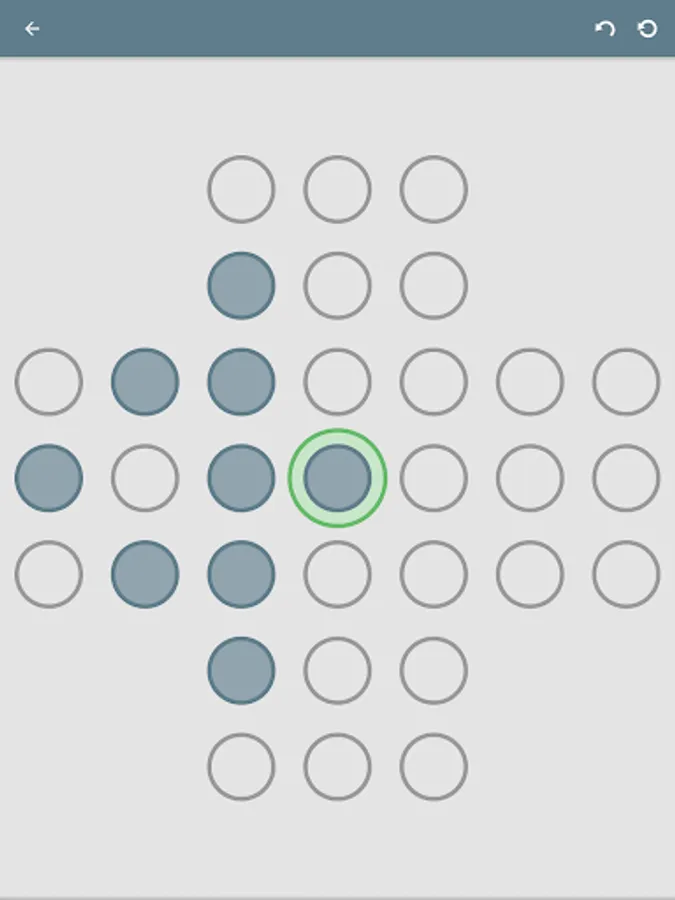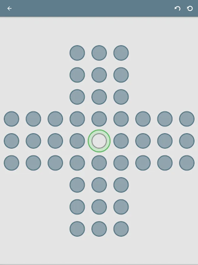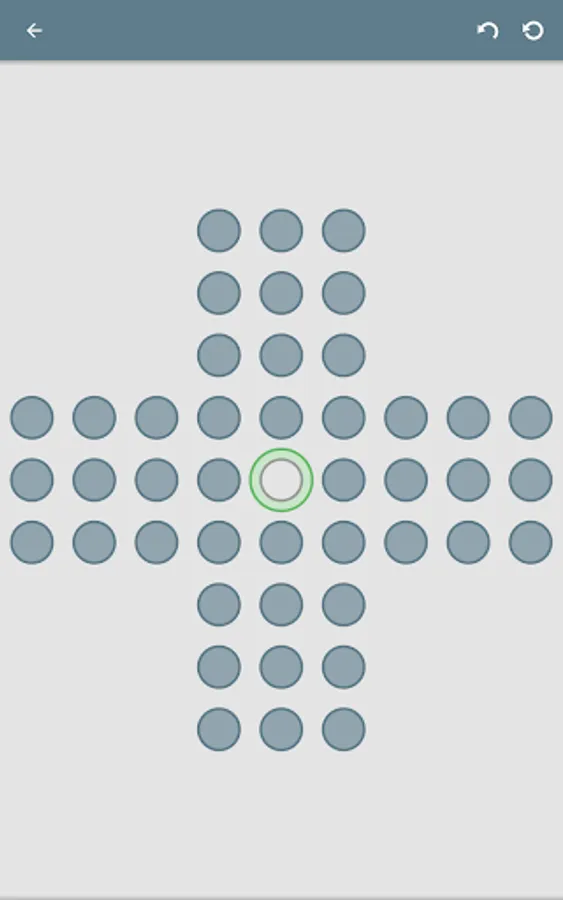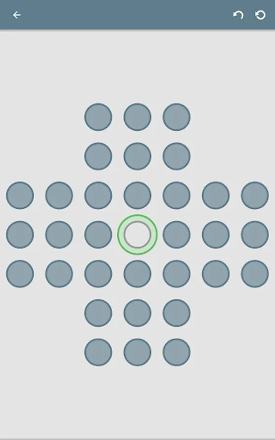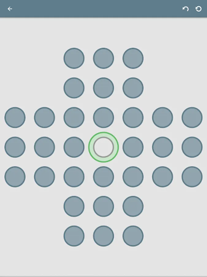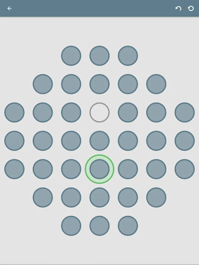 The objective of this traditional solitaire puzzle is to empty the entire board, except for a solitary peg in the green hole. A valid move is to jump a peg orthogonally over an adjacent peg into a hole two positions away. When a peg is jumped, it is removed from the board.