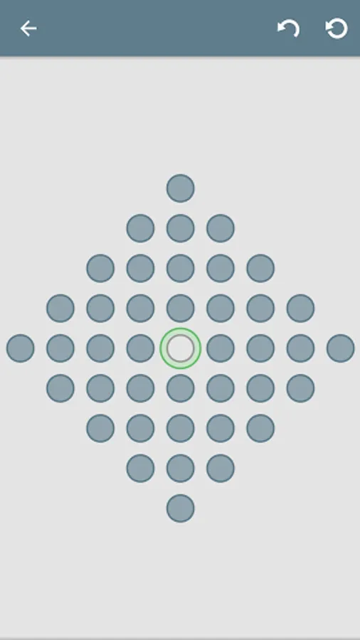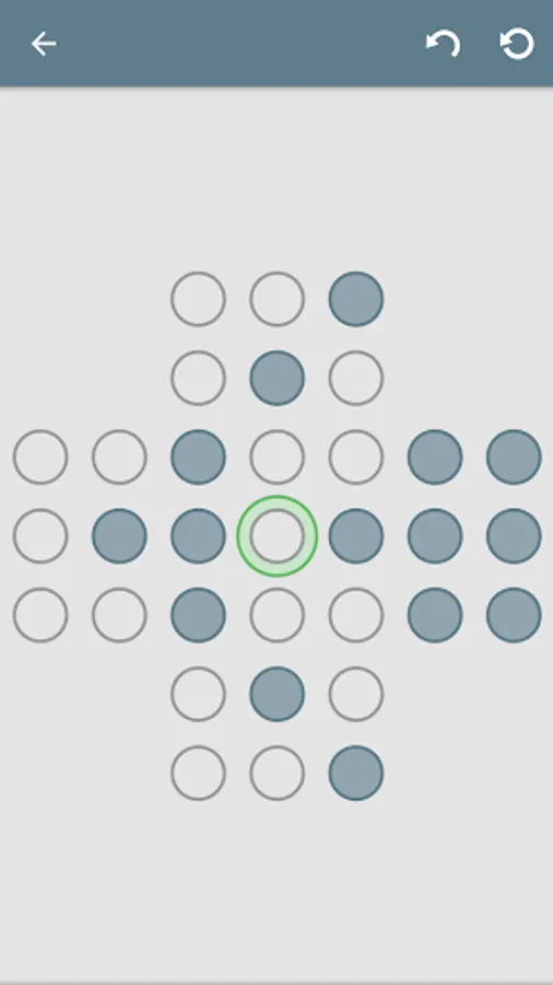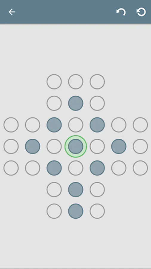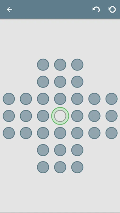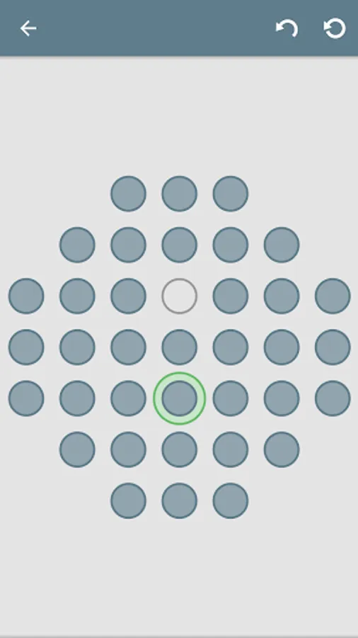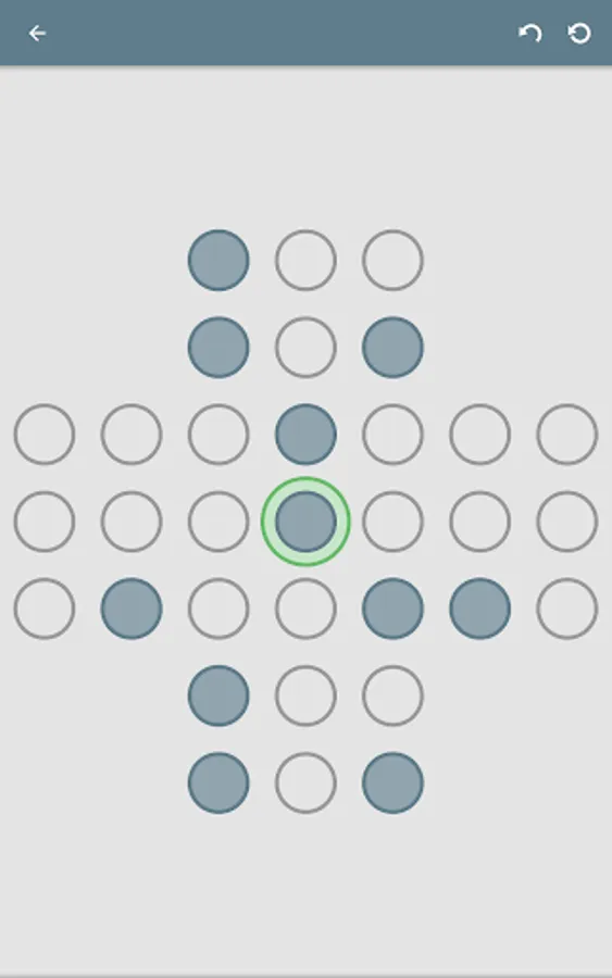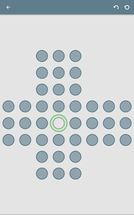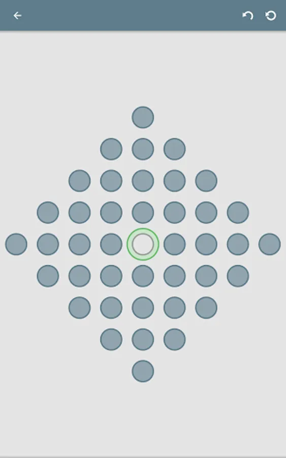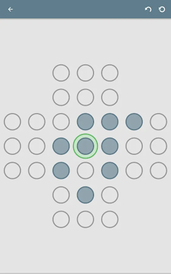 The objective of this traditional solitaire puzzle is to empty the entire board, except for a solitary peg in the green hole. A valid move is to jump a peg orthogonally over an adjacent peg into a hole two positions away. When a peg is jumped, it is removed from the board.