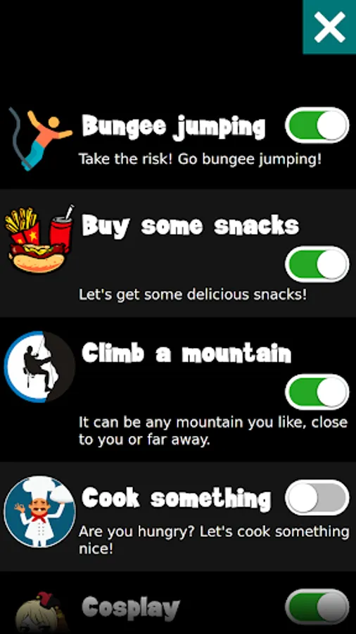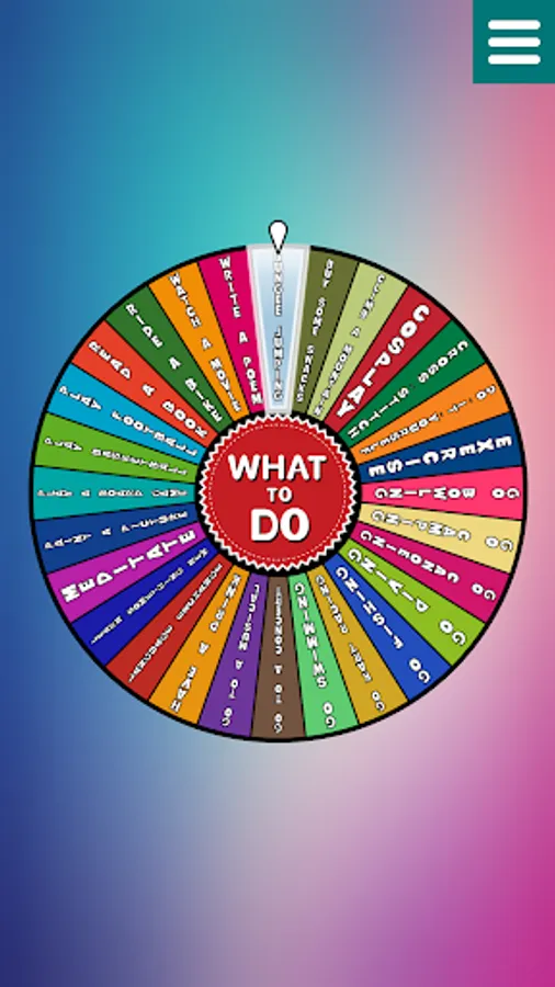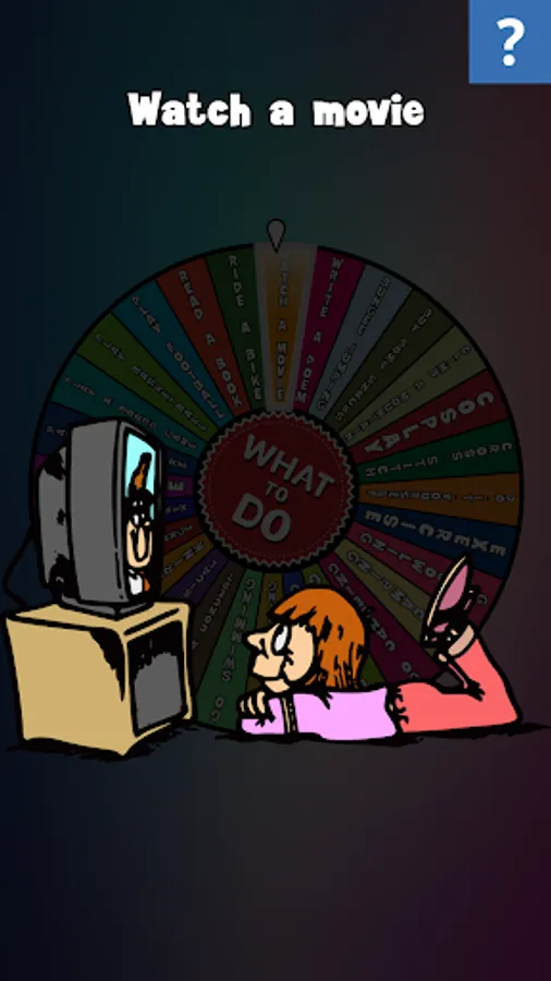"What to Do" will help you find out new activities you could do. There are plenty of funny things to do. It could be ride a bike, go to the cinema or go bungee-jumping! Spin the wheel and find out what to do next!