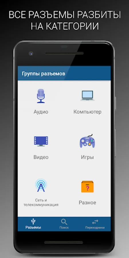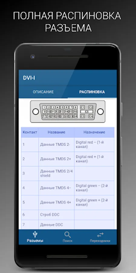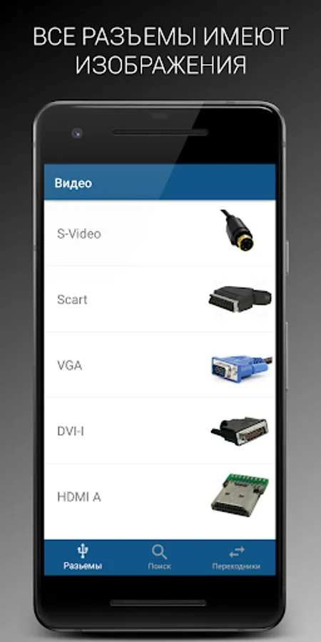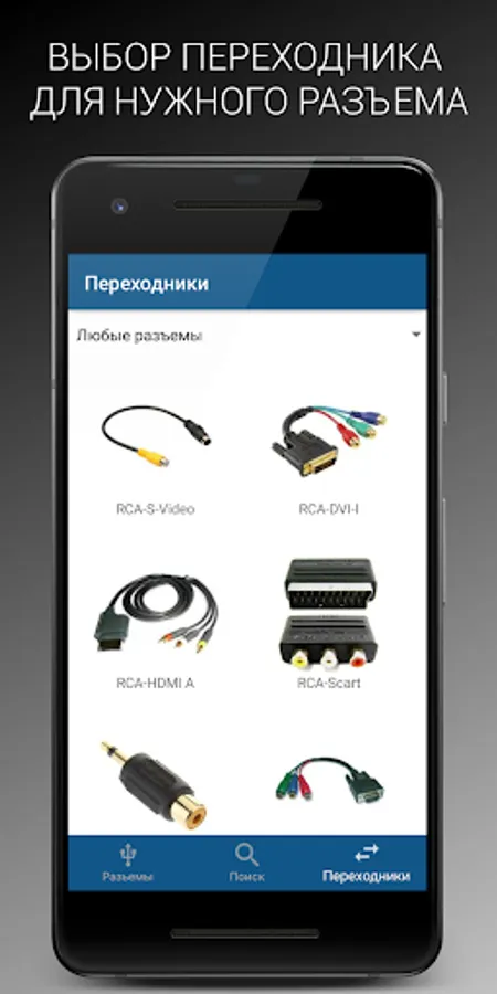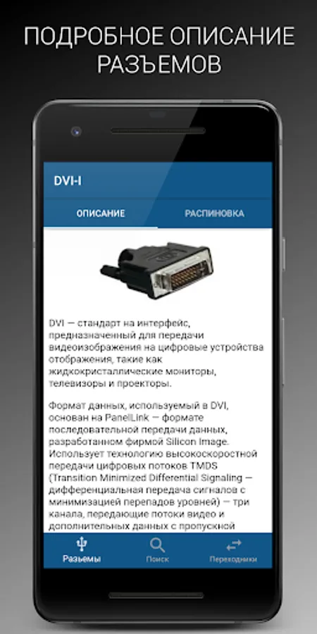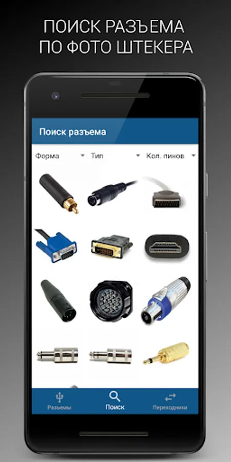 The application contains information on the main connectors used in audio, video, computer equipment, cars, networks, etc.