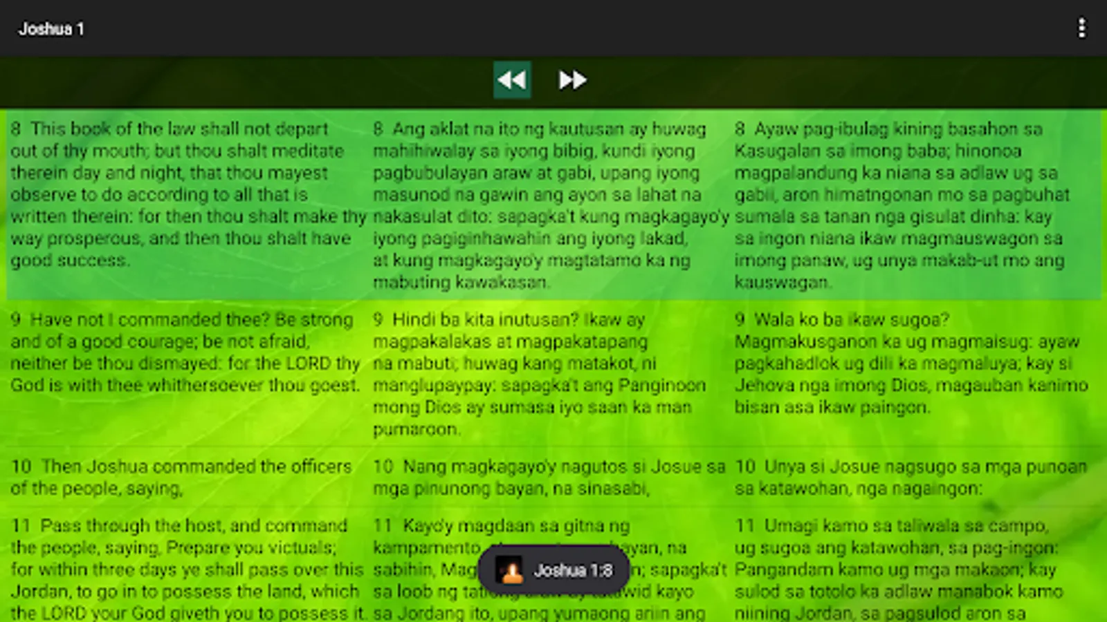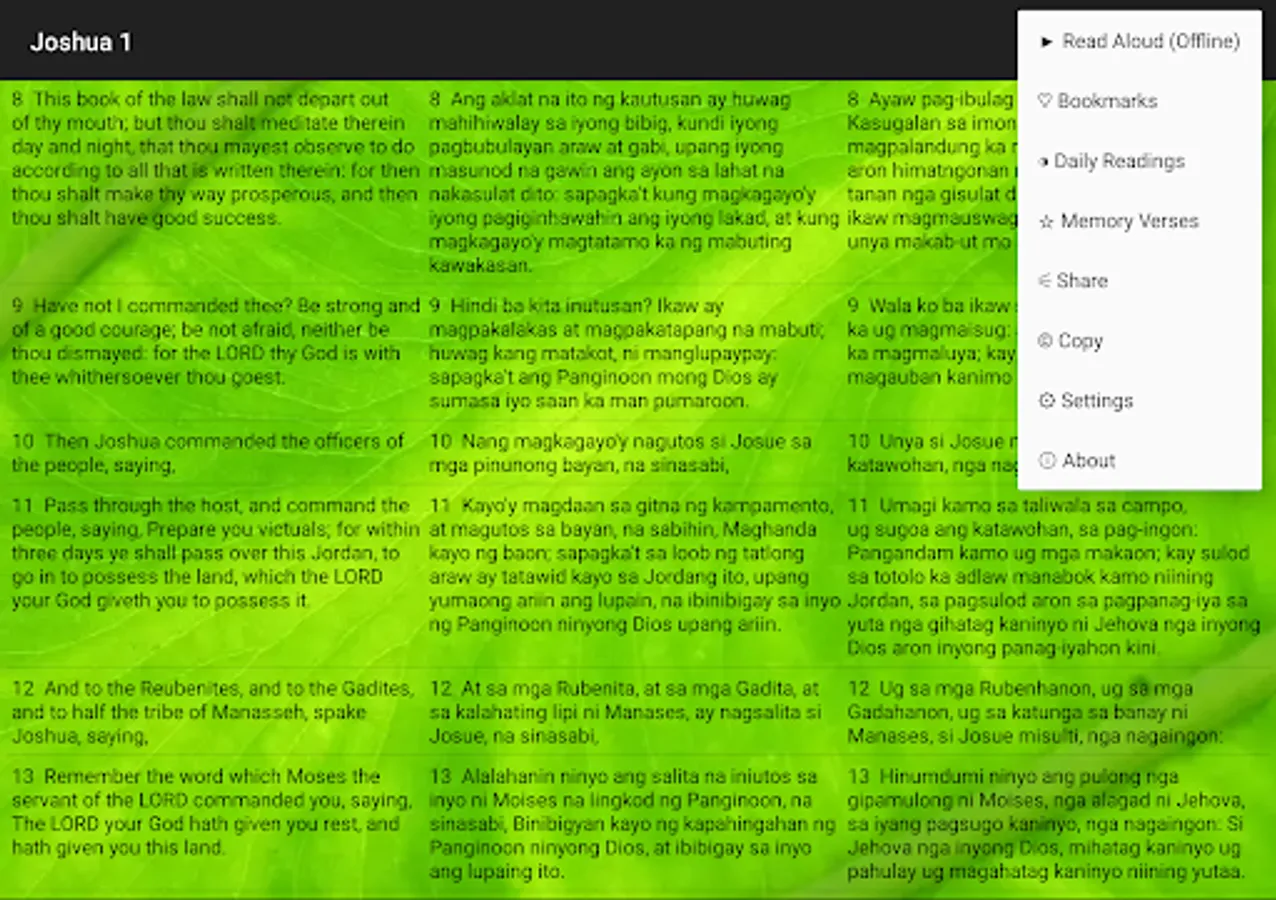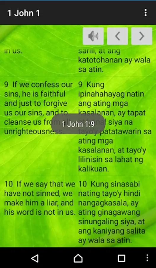 This Bible app uses the following versions: King James Bible (1611), Ang Biblia (1905), Cebuano Bugna and Cebuano Pinadayag. All versions' copyright are now in public domain. Except for King James whose copyright is still applicable in Great Britain.