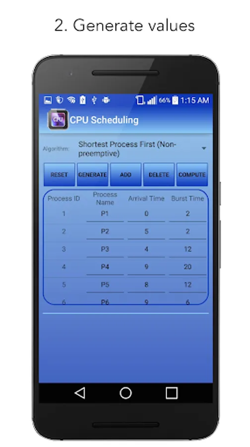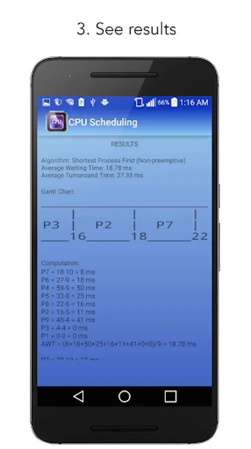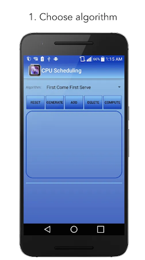 The main function of this app is solving and graphing different CPU Scheduling algorithms. The values plot in a bar graph and it gives you the algorithm that computes the average waiting and turnaround time.