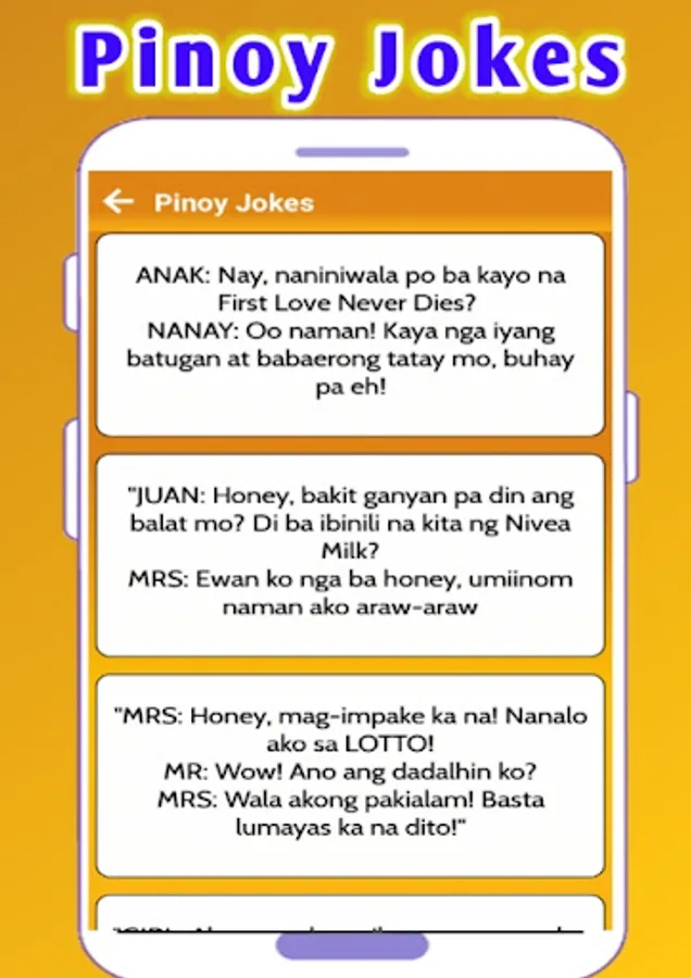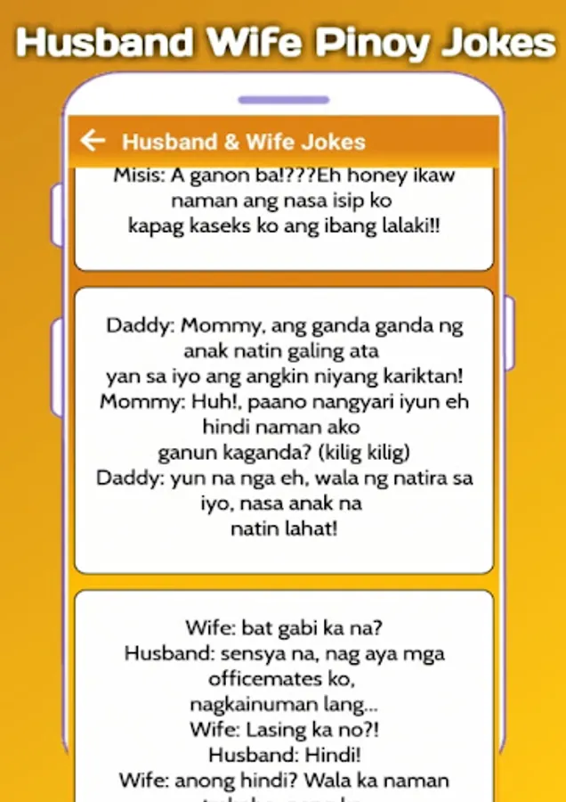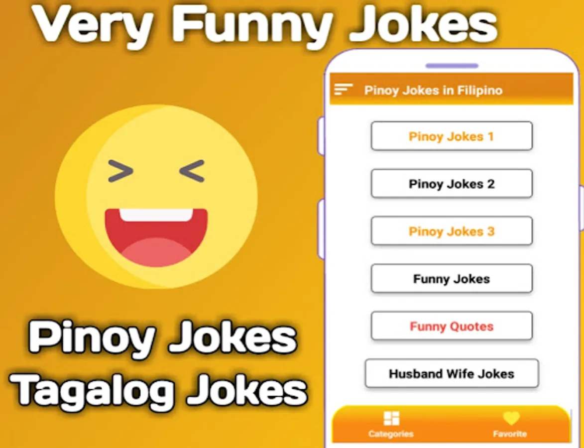 - We’ve classified the jokes in different categories so the app is easier to use: Pinoy Jokes , school jokes, husband and wife jokes, father and son jokes, Tagalog Magkumpare Joke and and many more.
