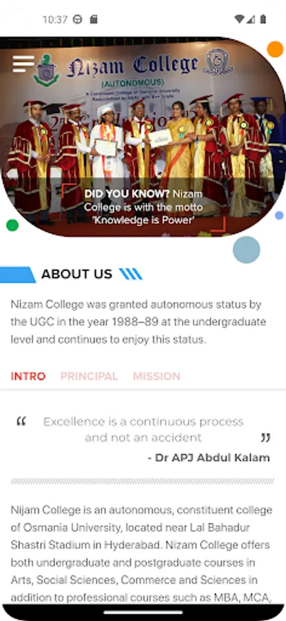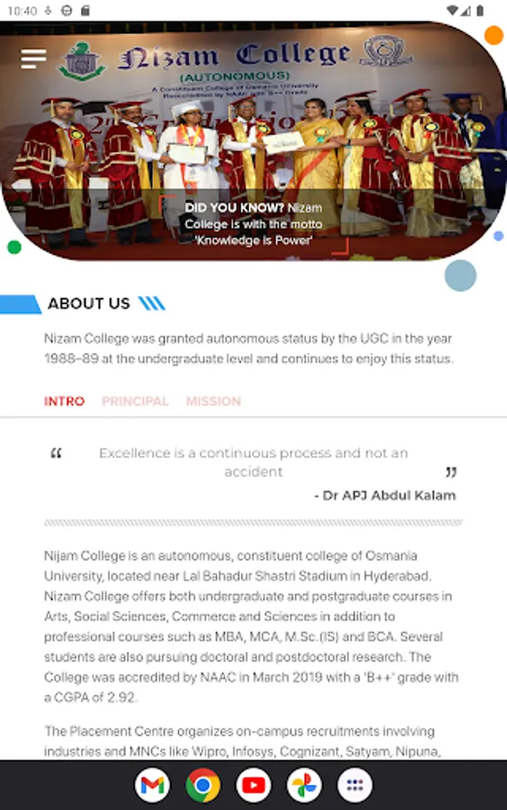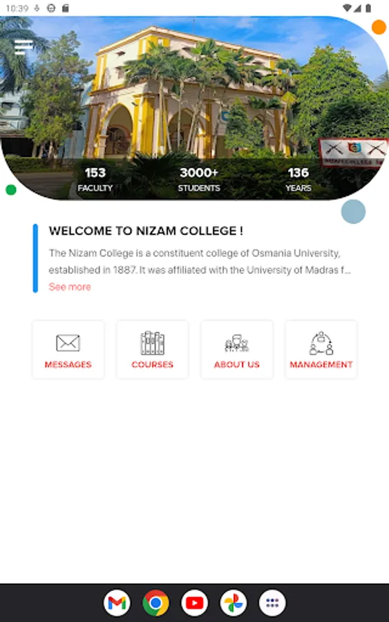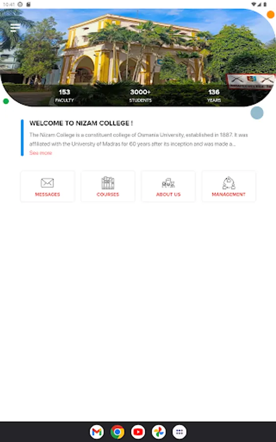 Established in 1887 by the amalgamation of Hyderabad School and the Madarsa-i-Aliya, Nizam College is one of the oldest and most esteemed institutions of higher education in South India. It was affiliated to the University of Madras for 60 years after its inception, and was made a Constituent College of Osmania University on 19th February 1947.