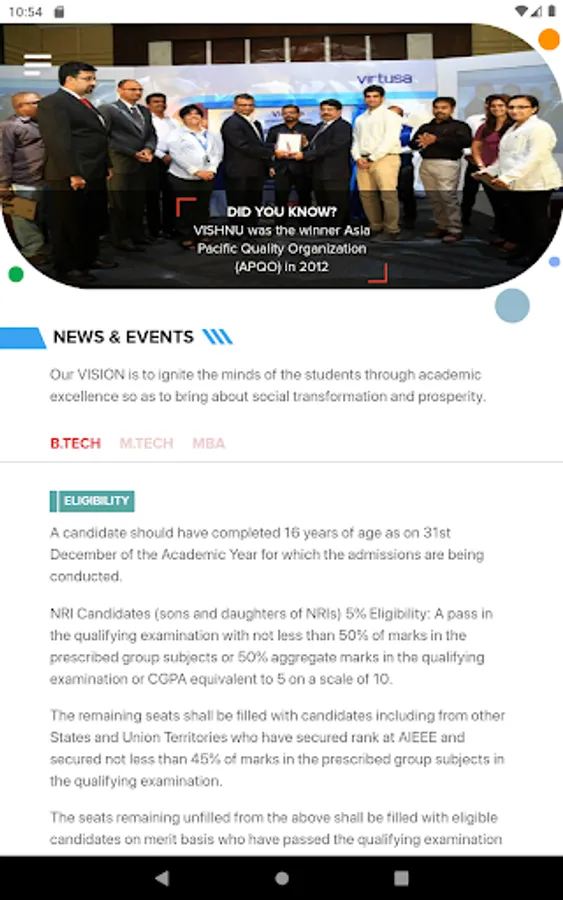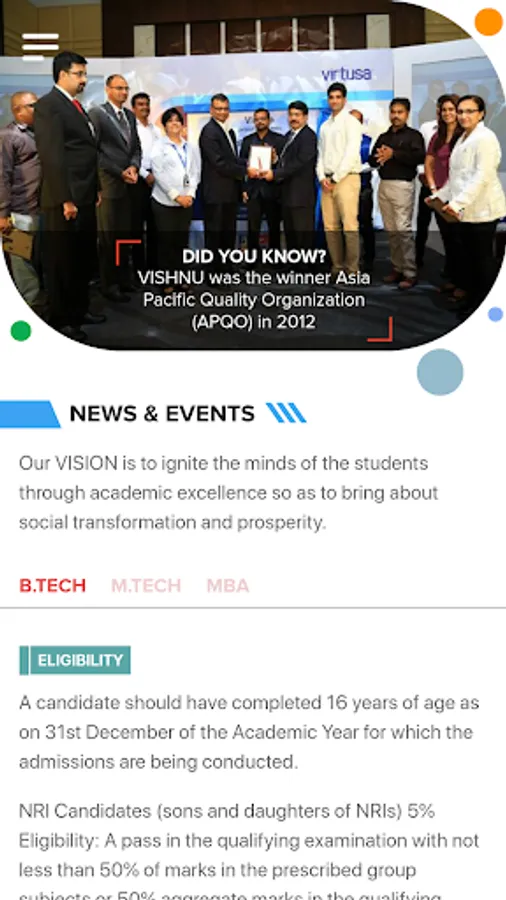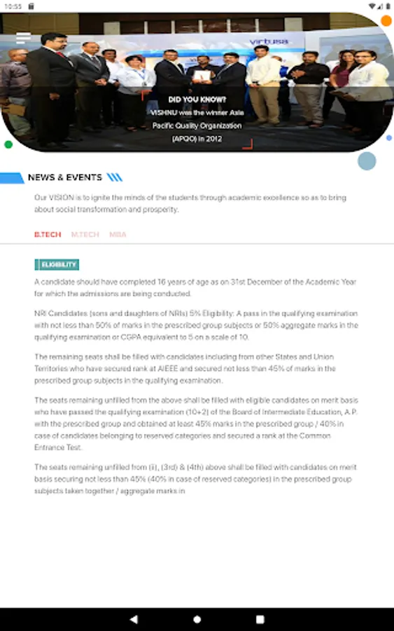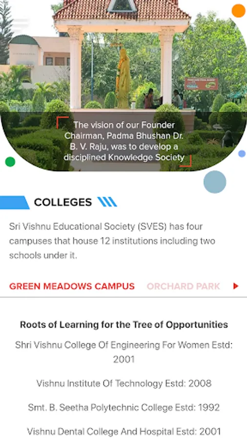 Sri Vishnu Educational Society (SVES) is an educational trust run by visionaries right from its inception in 1992. The Founder Late Dr. B. V. Raju was inspired by the concept of setting up quality educational institutions in tier 2 towns. He believed that education could transform lives and set up a women’s engineering college in his native town of Bhimavaram, West Godavari Dt., Andhra Pradesh that significantly transformed the region, especially where it influenced women towards higher education. He was awarded the Padma Shri and Padma Bhushan awards for his distinguished services and contribution in the field of education and cement industry.