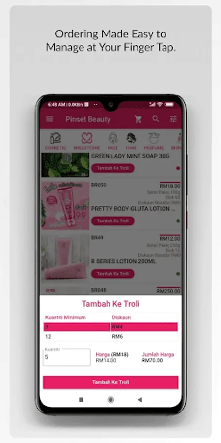 Aplikasi PINSETBEAUTY memudahkan anda melihat katalog produk jualan, membuat semakan harga (harga akan berubah mengikut status pengguna dan kuantiti belian), stok semasa setiap produk, pesanan/belian, bayaran online (FPX) dan pengesanan no jejak (tracking) serta rekod pesanan/belian.