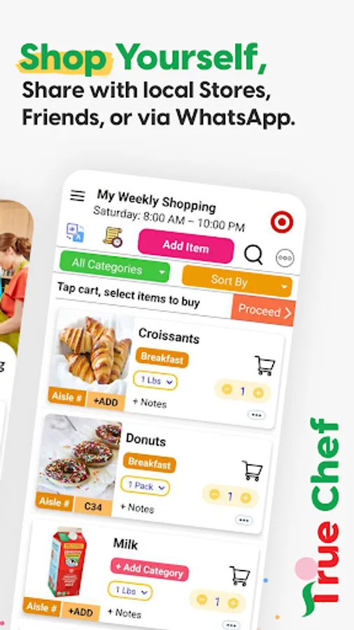 True Chef app saves money and time, reduces food waste, and improves shopping efficiency. It recommends the right items, quantity, and brands. It's like having a personal shopper in your kitchen. Share your list with stores for easy pickup or delivery, without sacrificing safety or quality.