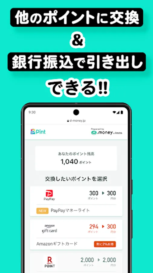 There are various exchange destinations such as bank transfer, EC site gift coupons, various electronic money, various points, and airline miles.