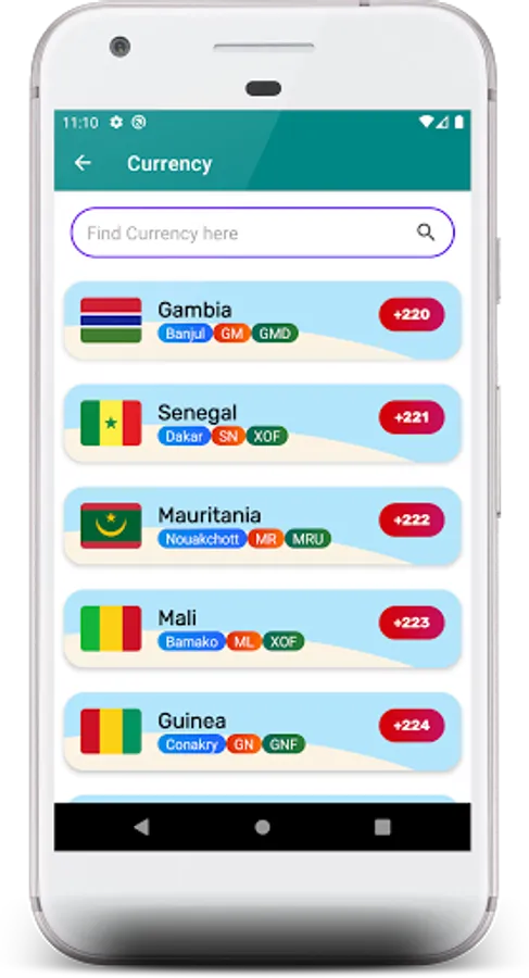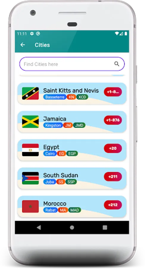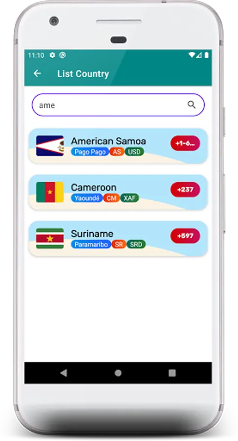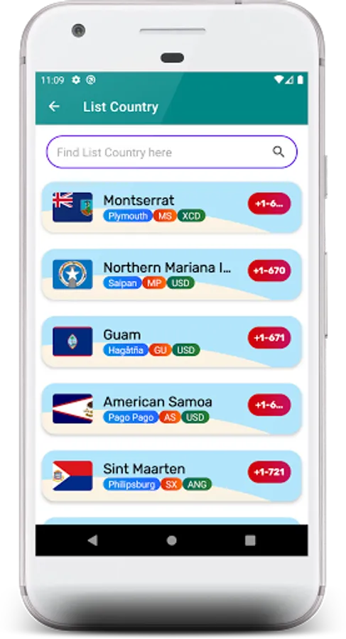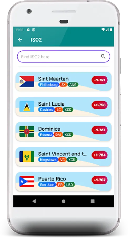 Country Code App shows the information more of 250 countries in the world like bellow: