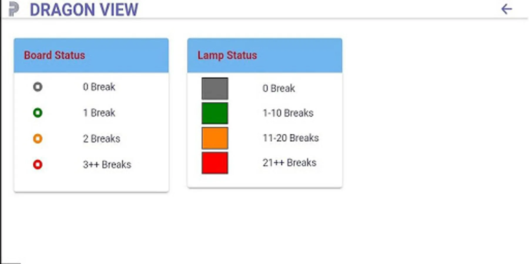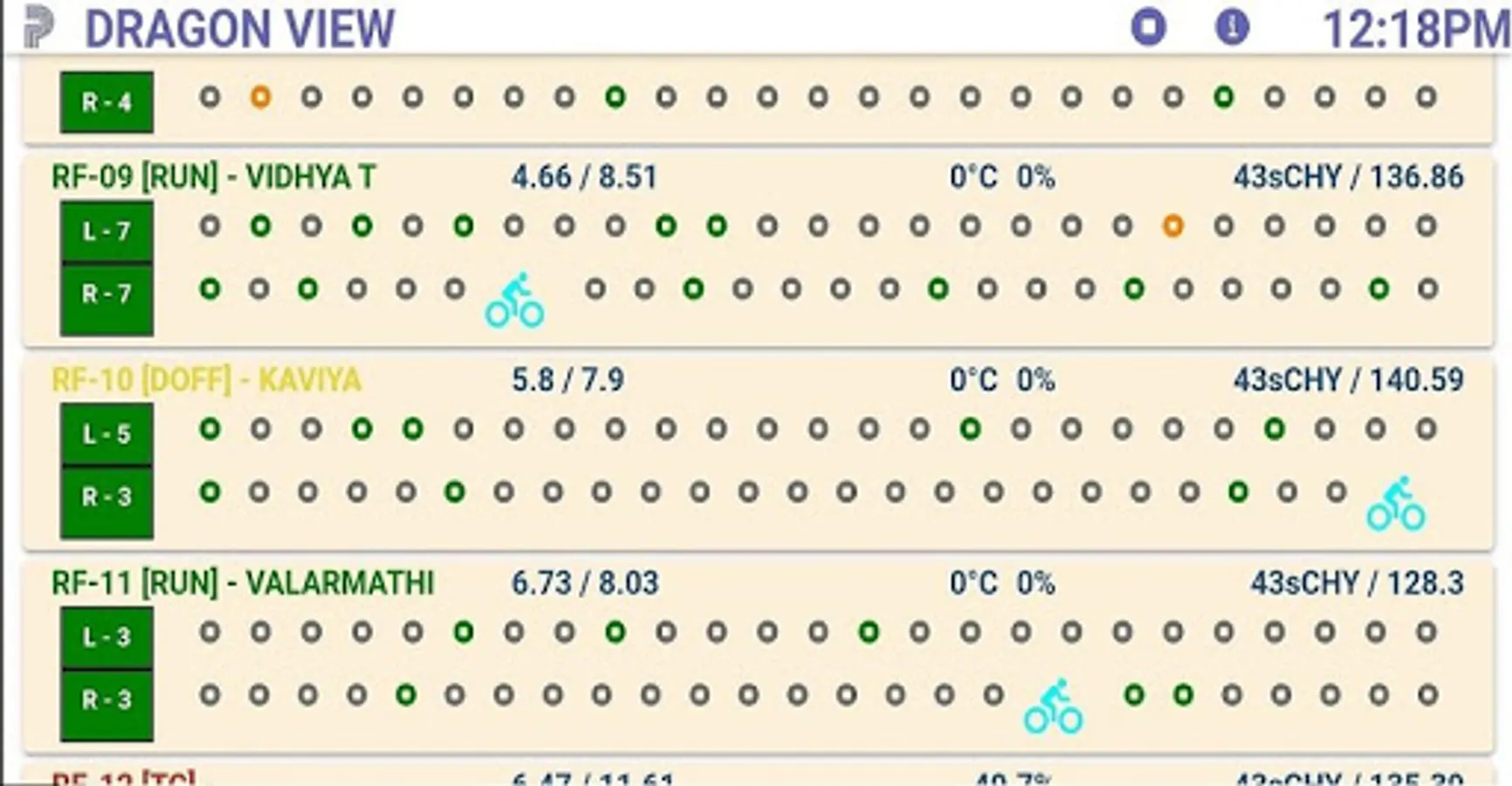 Dragon View - Its an overview of Shed, showing RingFrame layouts with sections in colours according to the Breaks occured currently. And also look into Overall Shift Operator performances with Mending time. Factory Manager can easily observe all details without even entering into to Factory.