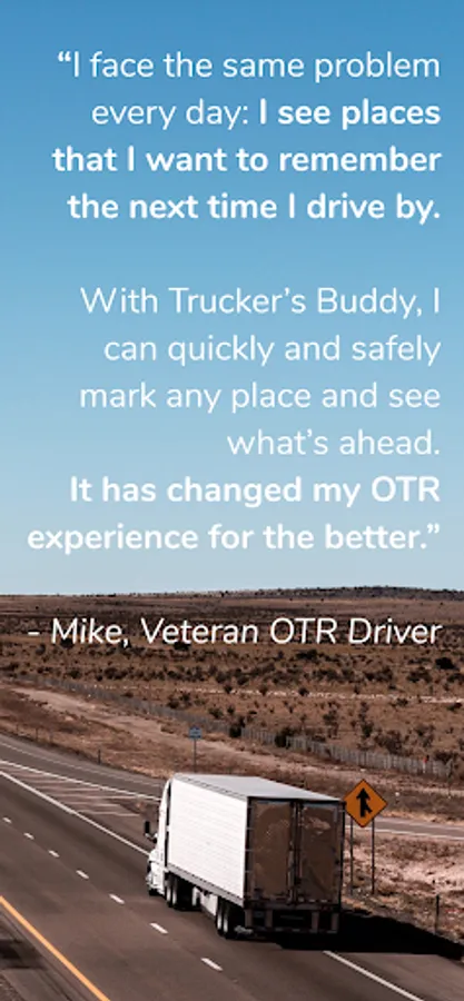“As a veteran OTR driver I found myself facing the same problem day after day: I would see a dozen places a day that I really wanted to remember the next time I came this way. A ramp with wide shoulders, rest areas, any number of good spots to shut down for the night etc.. but of course the same thing happened the next time. I would never remember. By the time I saw something it was either too late to take advantage of it, or the wrong time. I thought “there should be an app for that” and so with the help of my awesome friends at Pin Traveler, we created Trucker’s Buddy! It lets you quickly, safely, and accurately mark anything that interests you and the next time you travel that way, it will tell and show you exactly what is ahead of you. I drive longer, safer and with much less concern than ever before. It has changed my OTR experience for the better. I hope you find it as useful as I do.”