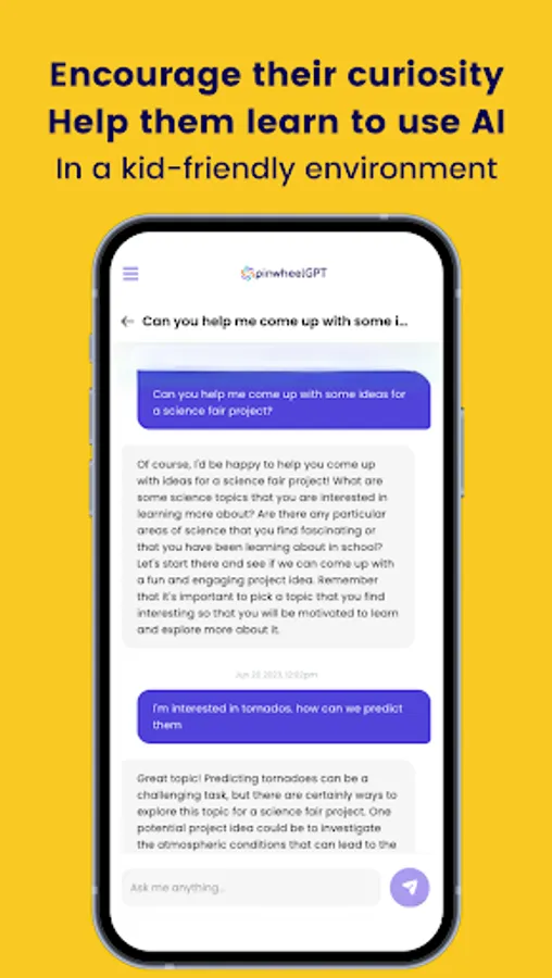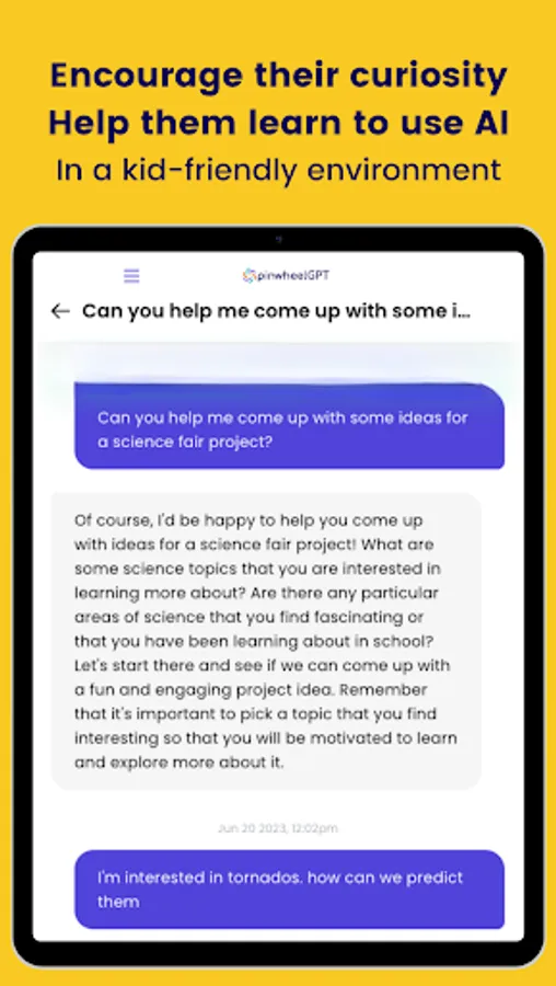 Let your kids' curiosity roam with an AI chat app built just for them. Powered by chatGPT technology, your kids can ask all their questions: