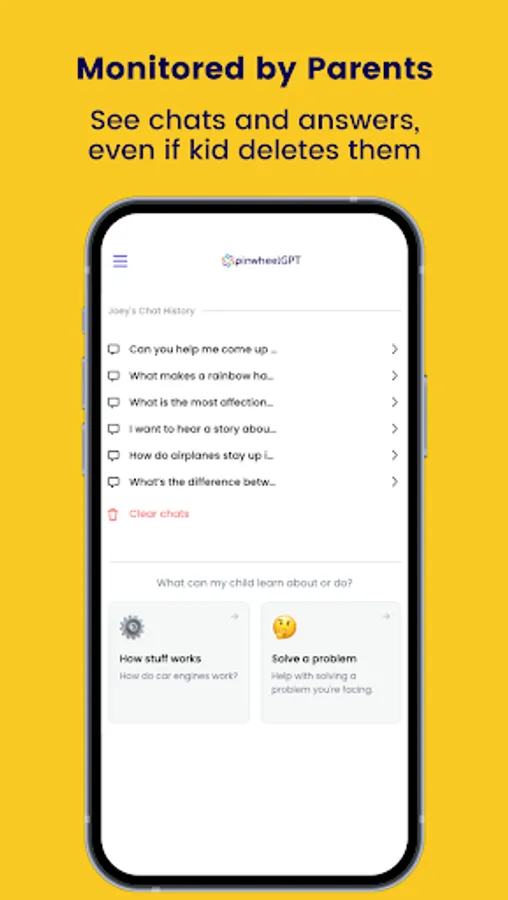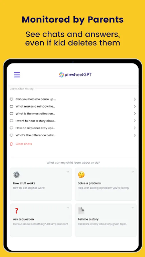 The parent portal lets you see your child’s conversations with the chatbot. So you get insight into what they’re asking, can clarify answers, and help your child learn to use AI technology.