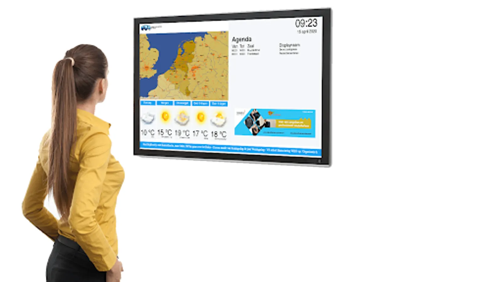 You can show activities. Display advertising. Show the local current weather forecast, but also show video films. With the RSS function you can show current news items. The combination with Zaalagenda.nl allows you to show the room reservations without having to perform a separate action.