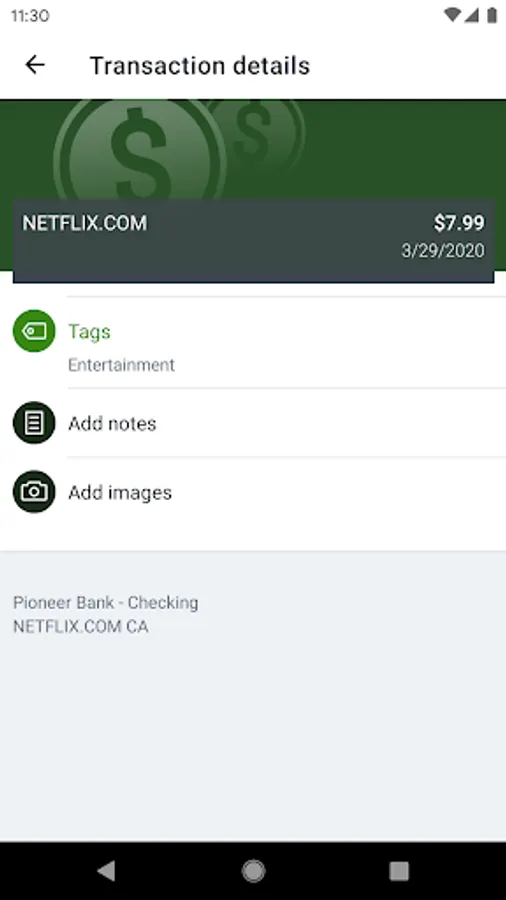 Add Tags, Notes, Images & Geo-Information: By enhancing transactions with custom tags, notes or photos of a receipt or check, you have the ability to stay organized and find exactly what you’re looking for when searching through your finances.
