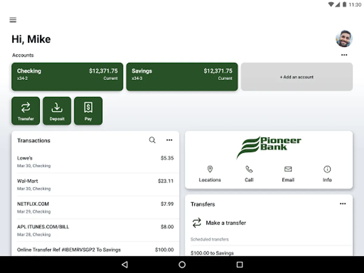 To use the Pioneer Mobile App App, you must be enrolled as an Pioneer Bank Internet Banking user. If you currently use our Internet Banking, simply download the app, launch it, and login with the same Internet Banking credentials. After you successfully login to the app, your accounts and transactions will begin updating.