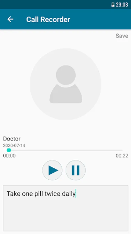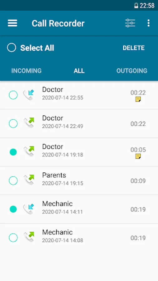 On the recording list you will see all recorded calls in groups of incoming and outoing. Every recording can be played back within application and you will be able to attach short note to each recording to easly manage and remember recordings content.
