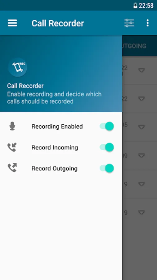 Application allows you to record incoming and outgoing calls. Recording is done in the background so you will not need to start/stop recording manually but application will do everything for you. Your configuration will survive phone poweroff so you will not need to remember to validate it. Ofcourse recording can be always disabled from application menu.