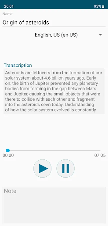 There is also button available to order Transcription. The most important thing is a language that is selected and usualy the current phone language will be preselected for you. This selected language will be used for speech recognition of an audio data.