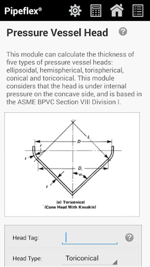 ✔ Pressure Vessel - this module have two sub-modules: pressure vessel head (calculate the following types of head: ellipsoidal, hemispherical, torispherical, conical and toriconical) and pressure vessel shell (calculate the following types of shell: cylindrical and spherical), both calculated using ASME Section VIII Division I.