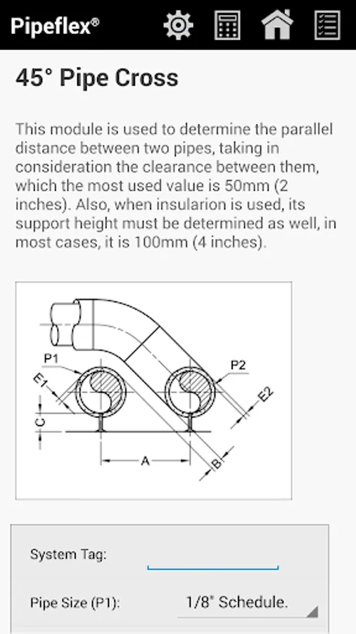 ✔ Pipe Diameter - used to calculate the pipe diameter needed to carry the fluid with the designed flow, this module uses the pressure loss equations to find the diameter.