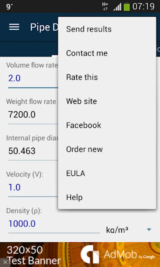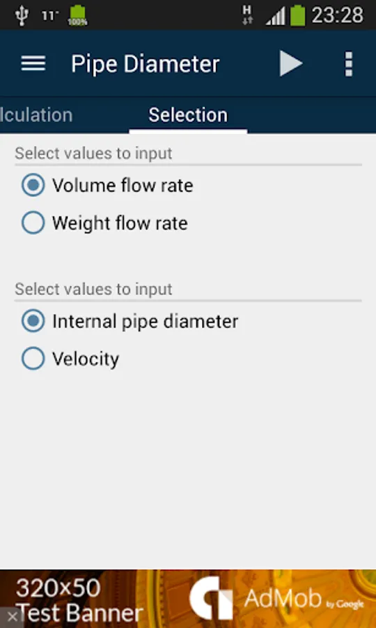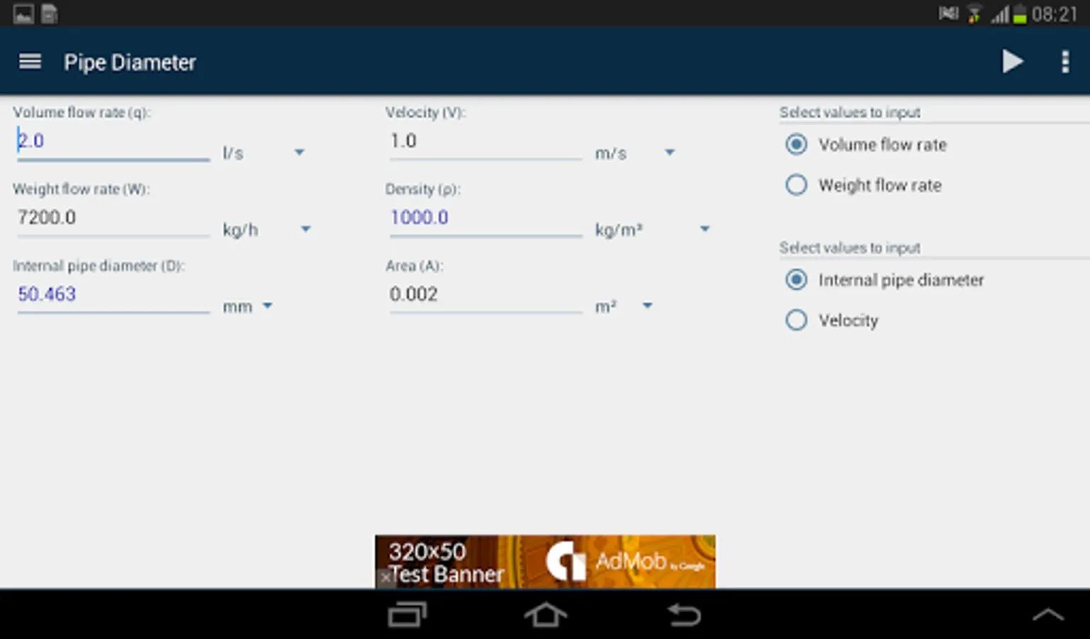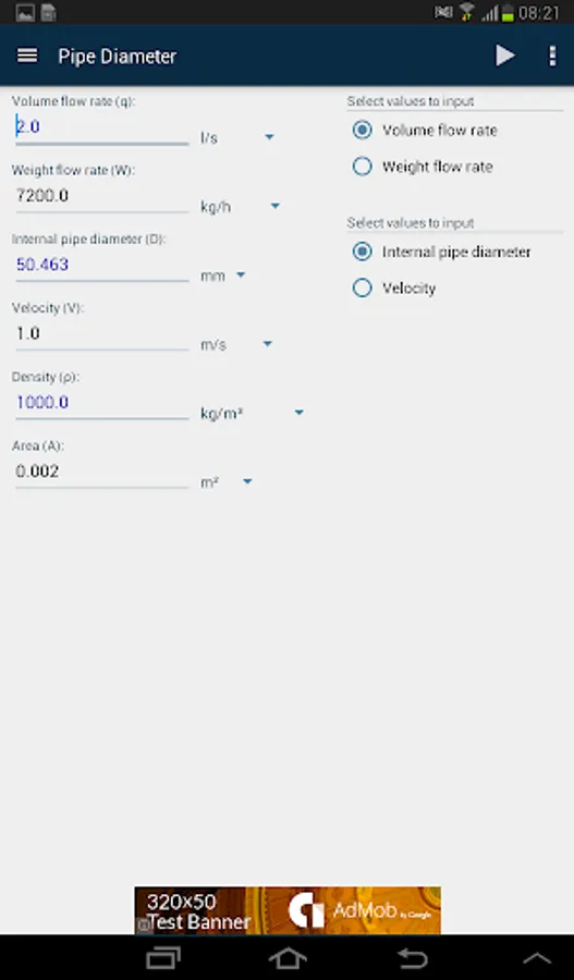 Check of stream velocity through pipe with known internal pipe diameter and given flow rate is enabled.