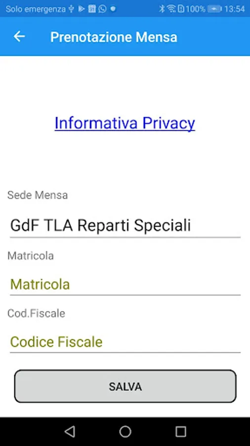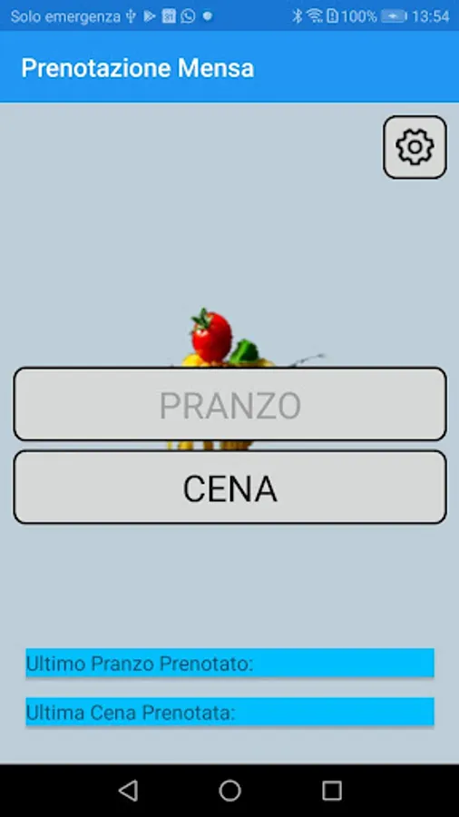 At the first start it is necessary to set only the serial number and the fiscal code, then it will be possible to book the "lunch" or "dinner", exclusively of the current day, by "clicking" simply on the relative button.