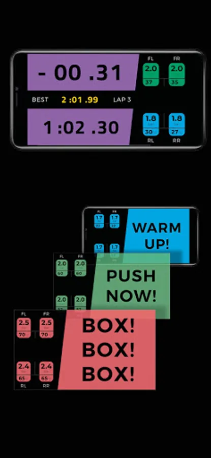 The live view recommends to the passenger, with clear and direct messages, the right moment to try the best lap or to make a pit stop and to reset the pressure to the recommended level.