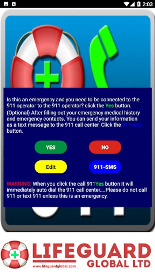When the E911 service is fully implemented you will have two options, 1) To click the 'Yes' emergency button which will auto-dial to the 911 operator (voice). Or 2) Click the E-911sms™ button, that will allow you the ability to send your name, age, mobile number, emergency contacts, medical history and [GPS location] –as a SMS text message.