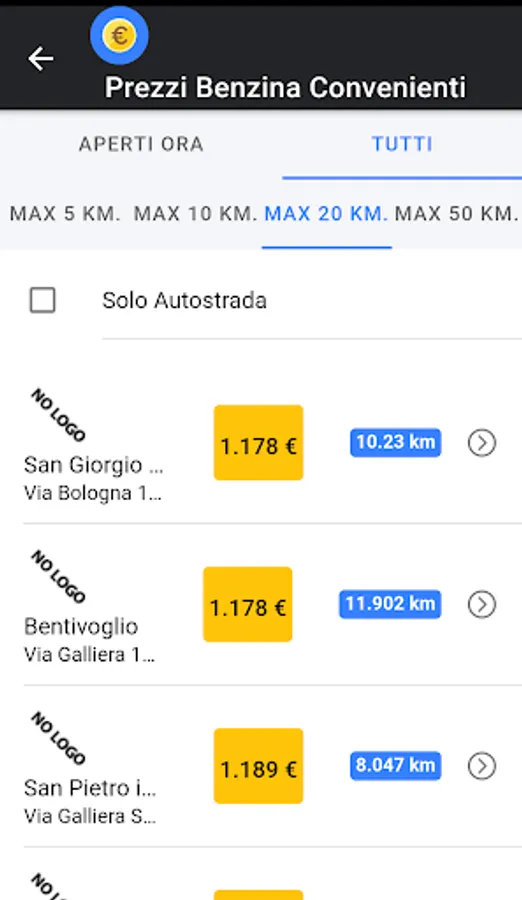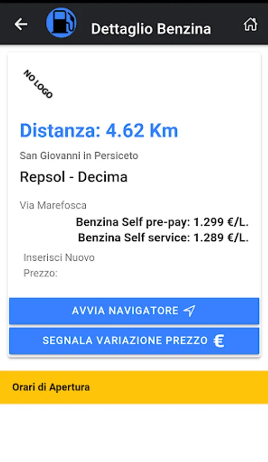 Thanks to Petrol Distributor Search, you will have the possibility to find the Petrol Station (E5, E10, E85) for your car, in the shortest possible time. With the "NEARBY DISTRIBUTORS" function, you will get the list of distributors closest to your position, with the possibility of seeing only those open at the time of the search, or all the distributors; in addition, with the "HIGHWAY ONLY" option, only the distributors present on the highways will be reported. Selecting the single distributor, you will have all the distributor data at hand, and with a simple gesture, you can start navigating to the distributor itself. The information on the current price of fuel in that distributor, the possibility to see the opening hours and to report a change in the price, complete the functions present in the distributor tab.