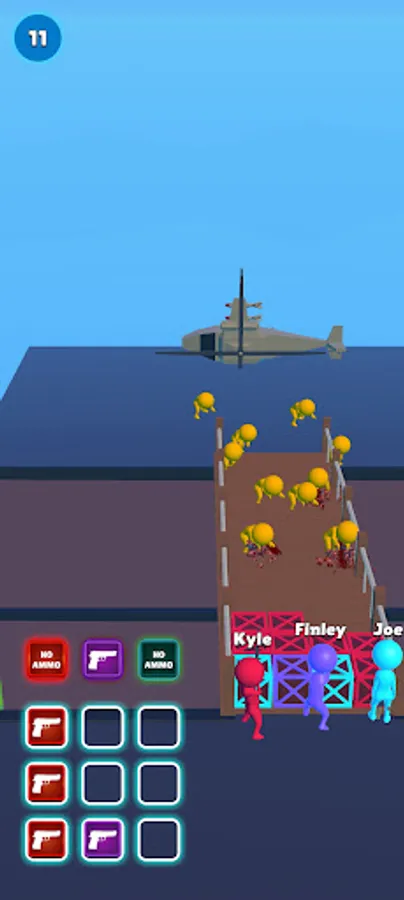 Do not let the zombies through by combining various weapons. Increase your strength and defense by collecting obstacles and weapons.