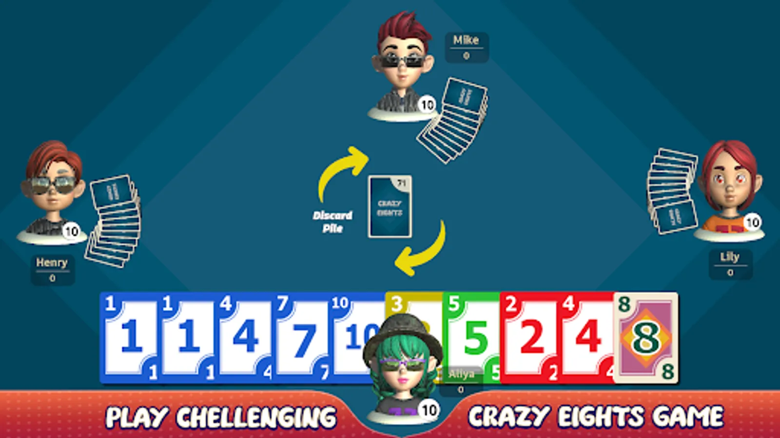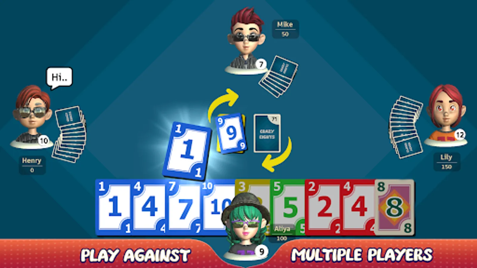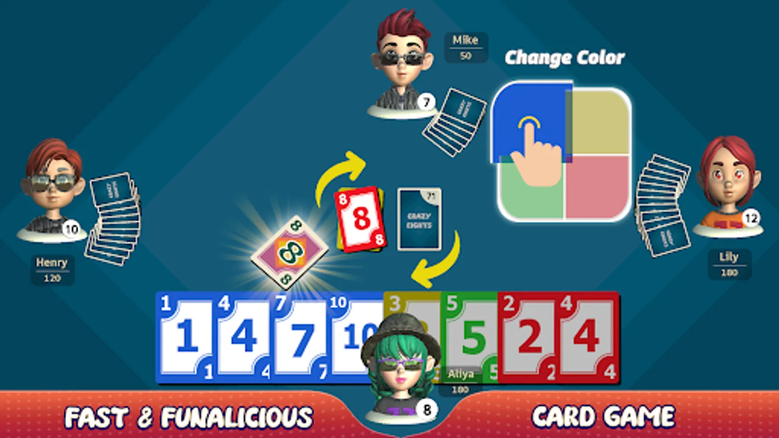 Crazy Eights is a simple, addictive, and fun game for 2-4 players. Suit up for action with your favorite characters from the Crazy Eights world! Play anytime, anywhere without an internet connection.