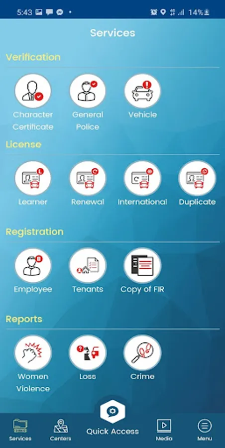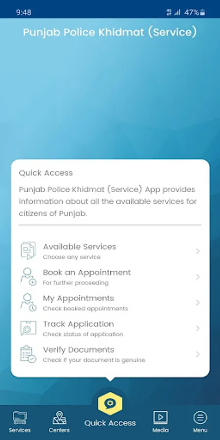 This application provides detailed information (fees, office locations, required documents, online booking etc.) about 14 services offered by Punjab Police to the citizens at Police Khidmat Markaz (offices) recently established across Punjab. Application includes following features: