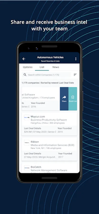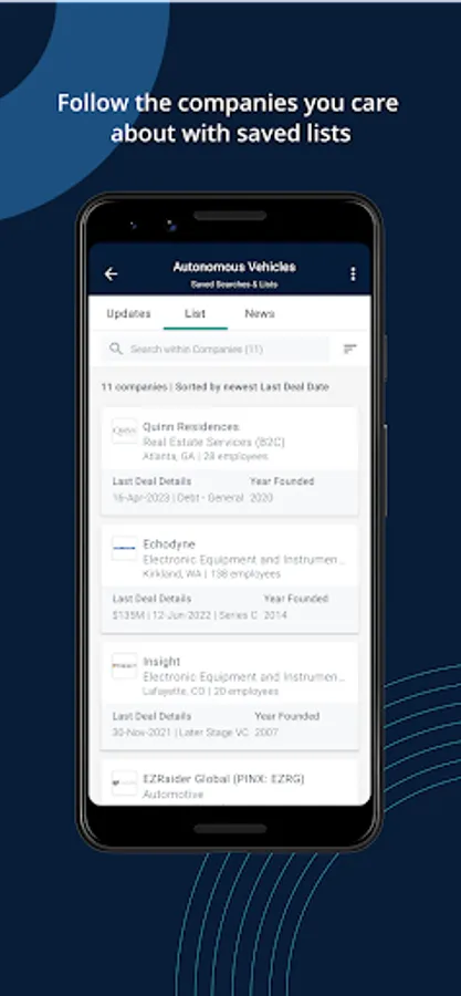 Our mobile app puts the entire world of VC, PE and M&A at your fingertips, ensuring you have on-the-go access to the industry news and financial data you need to track activity in your space, conduct due diligence and easily connect with dealmakers. Instantly get in-depth information on: