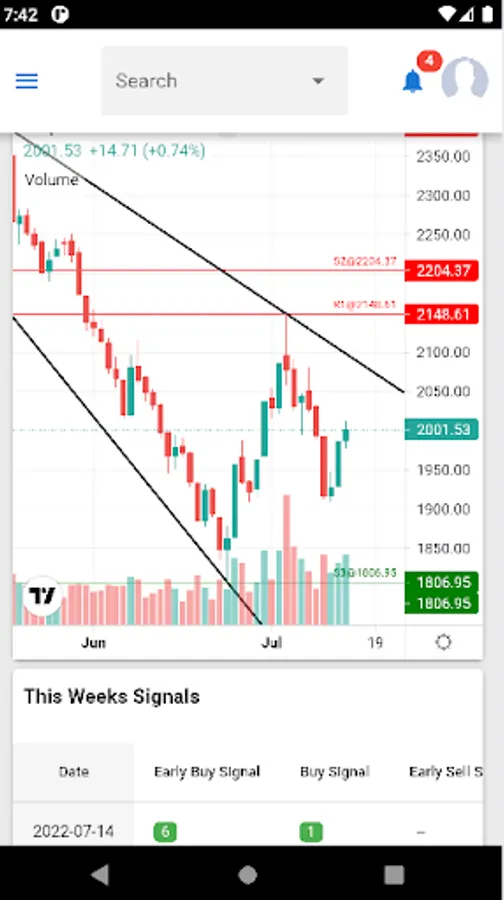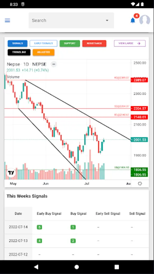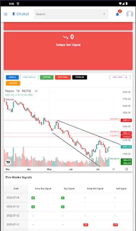 Chukul also finds the support and resistance points automatically for the ongoing trend in individual stocks. Support point is the probable low point a share value might drop and resistance is the probable high point from where it may reverse.