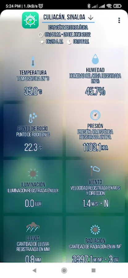 Now you can know the climate of the city of Culiacán whenever you want, thanks to the weather application of the Technological Innovation Park of the Autonomous University of Sinaloa. In it you will be able to see for free and in real time the levels of temperature, solar radiation, intensity and direction of the wind, lighting, humidity, pressure, amount of rain and dew point in the city of Culiacán, Sinaloa. You will also be able to know precisely the time of sunrise and sunset.