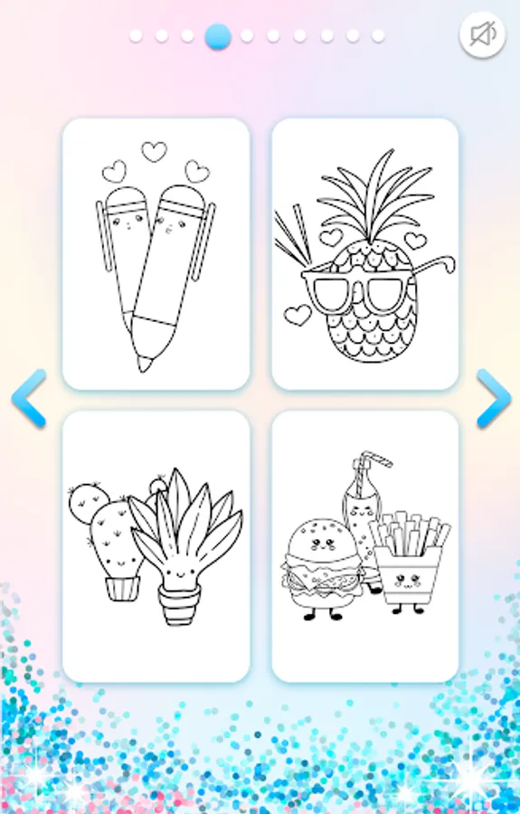"Kawaii Coloring Book Glitter" has a large collection of cute kawaii coloring pages. Colorize beautiful kawaii pictures with fairy characters and animals - kawaii unicorn, cute mermaid, narwhal and llama! Also you will find here a variety of beautiful pictures in kawaii style with hearts kawaii girls, cactus, kawaii food, stars and much more!