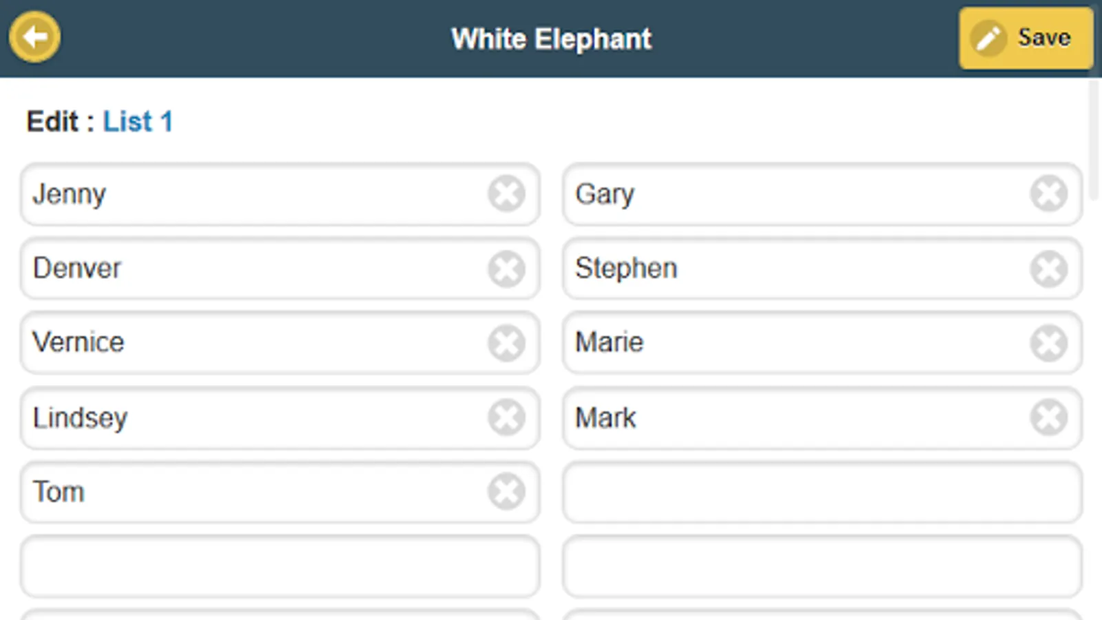Still playing that same old White Elephant game from 20 years ago? Get with the times! There's an app for that. Throw away those silly paper numbers, and forget about calling out, "Who's number 10? 10? Anyone? Does anyone have 10?". This new app does everything for you. Besides, your family are friends are more than just numbers. But wait, there's more! People are randomly chosen to go next AND they are randomly given a specific Action to do. Adding this twist to the original is guaranteed to increase the fun factor by at least 10. 10? Anyone have 10?