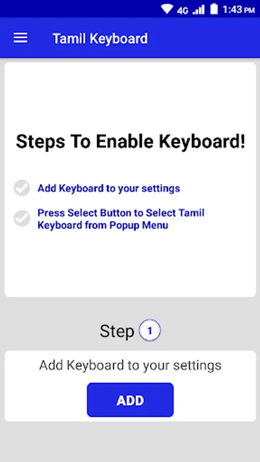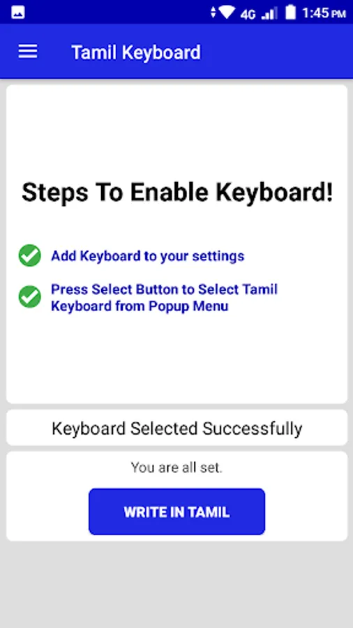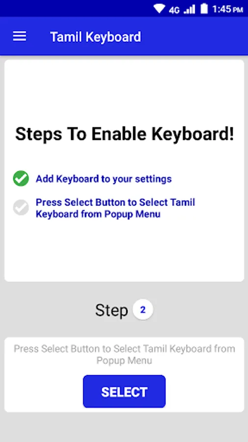 The app have an easy to follow steps to enable the Tamil Keyboard for you. It guides how to set keyboard as default in easy 2 steps only.