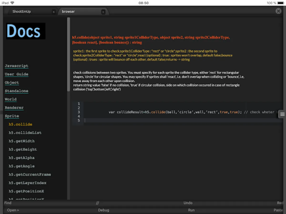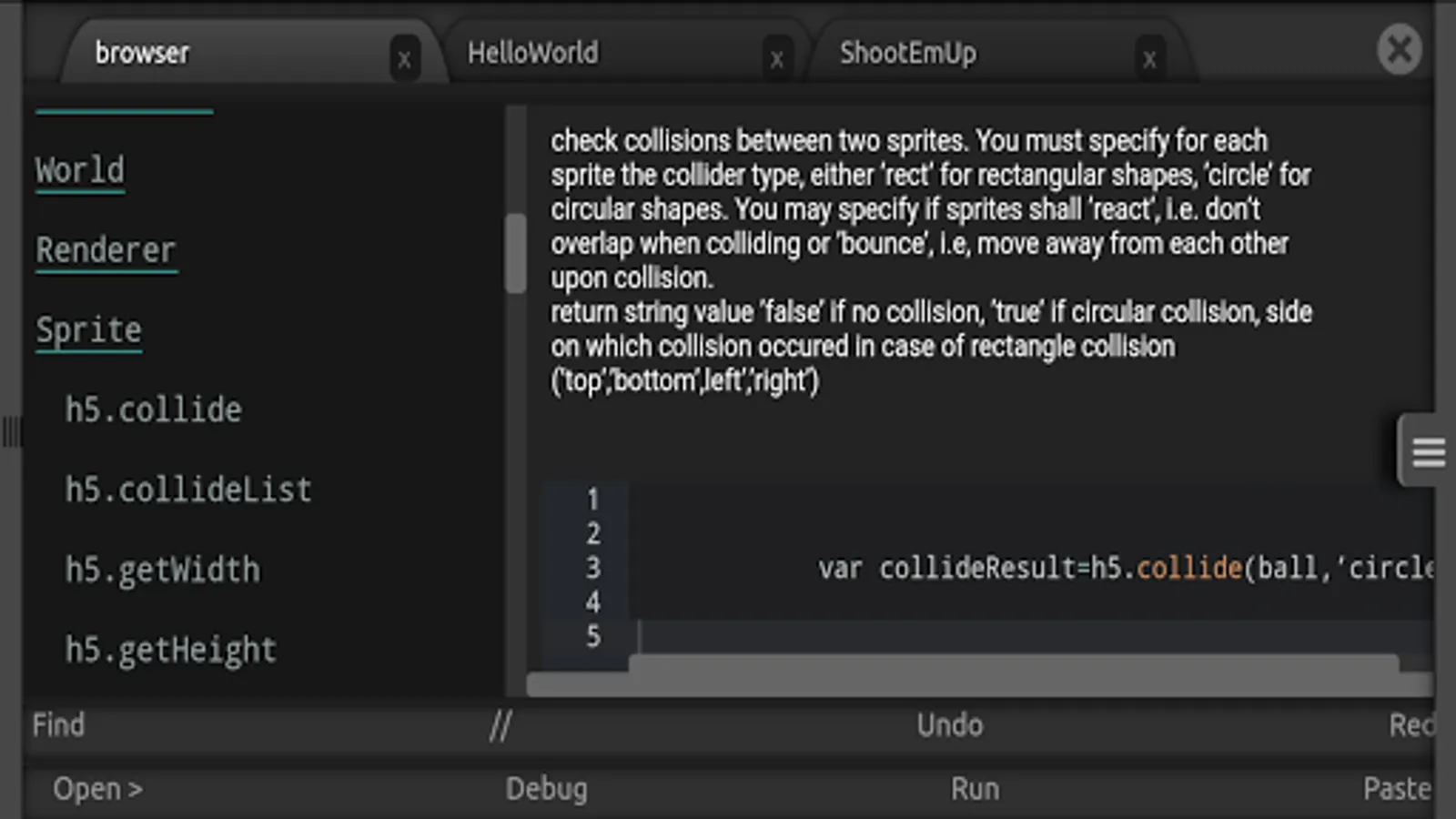 HTML 5 Game Engine includes many graphical/sound/physic functions all described with use case examples in an API Reference