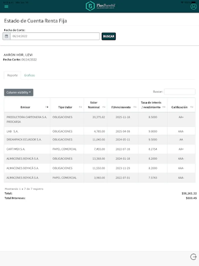 Easily consult all your transactions carried out through PLUSBURSATIL, and obtain the information contained in the stock market settlement. In this way, you can also check your fixed-income and variable-income account statements, upcoming maturities, etc., thus keeping proper control of your investments.