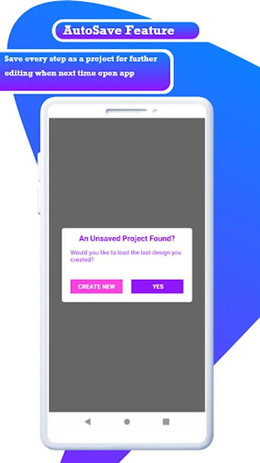 Auto Save:- Save every step as a project when you open the app next time it shows as an unsaved project for further editing previous unfinished design.