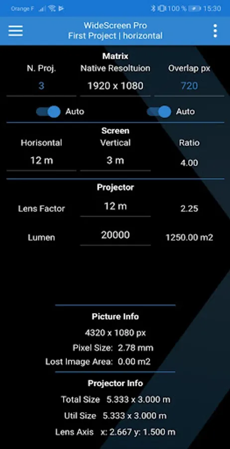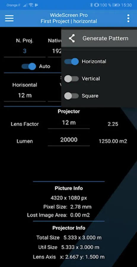 WScreenPro also allows to calculate the optical report as well as the power in m2 or sq ft.
