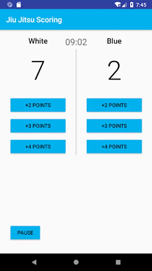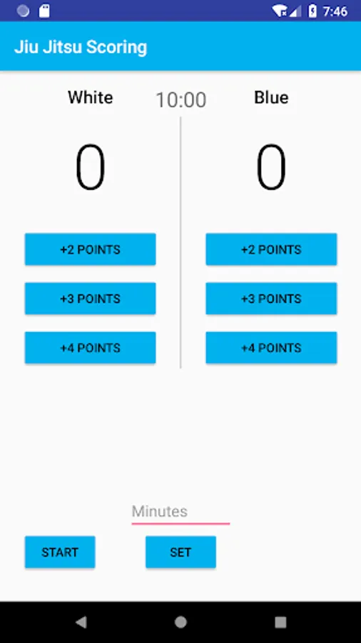 Jiu Jitsu Scoring provides a sleek interface to score and time jiu jitsu matches. Points can be scored in increments of 2, 3, and 4. There is an easy to use timer that can be quickly set for matches spanning different lengths. The timer allows for pausing and restarting to maintain the integrity of the match. After the match is over one button will reset the scores and the timer to their starting state.