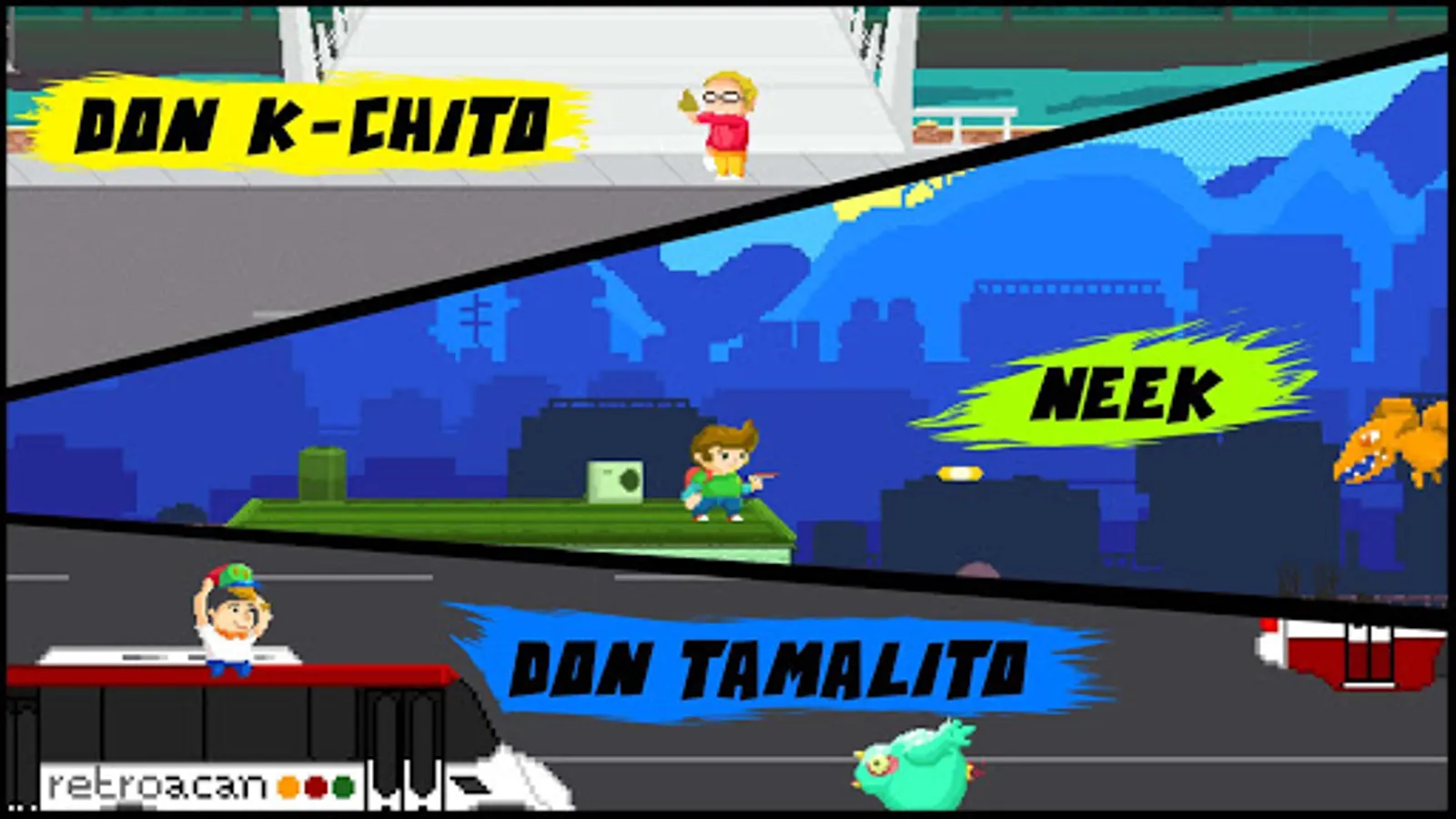 Retroacan is an action platformer game with an old school aesthetic. The whole city has been invaded by mysterious pixelated monsters, so it's up to Neek and his allies to save the day!