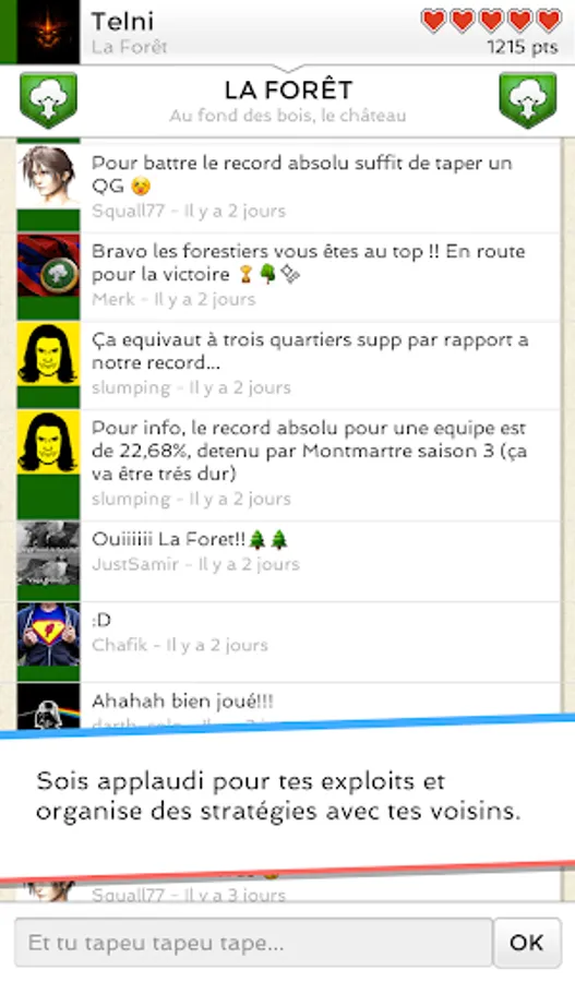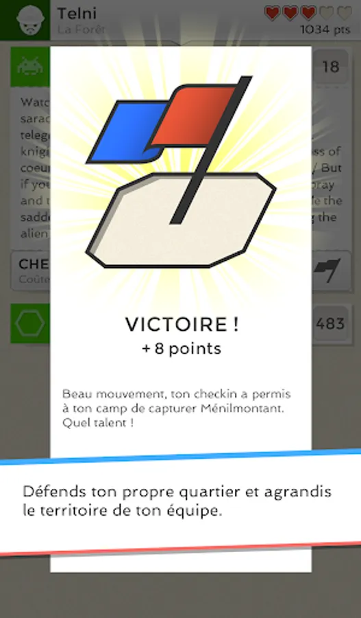 Neighborhoods are won by localizing (checkin) using the mobile application. Each checkin earns points his army for the area in question and the army having scored the most points takes control ... at least temporarily.
